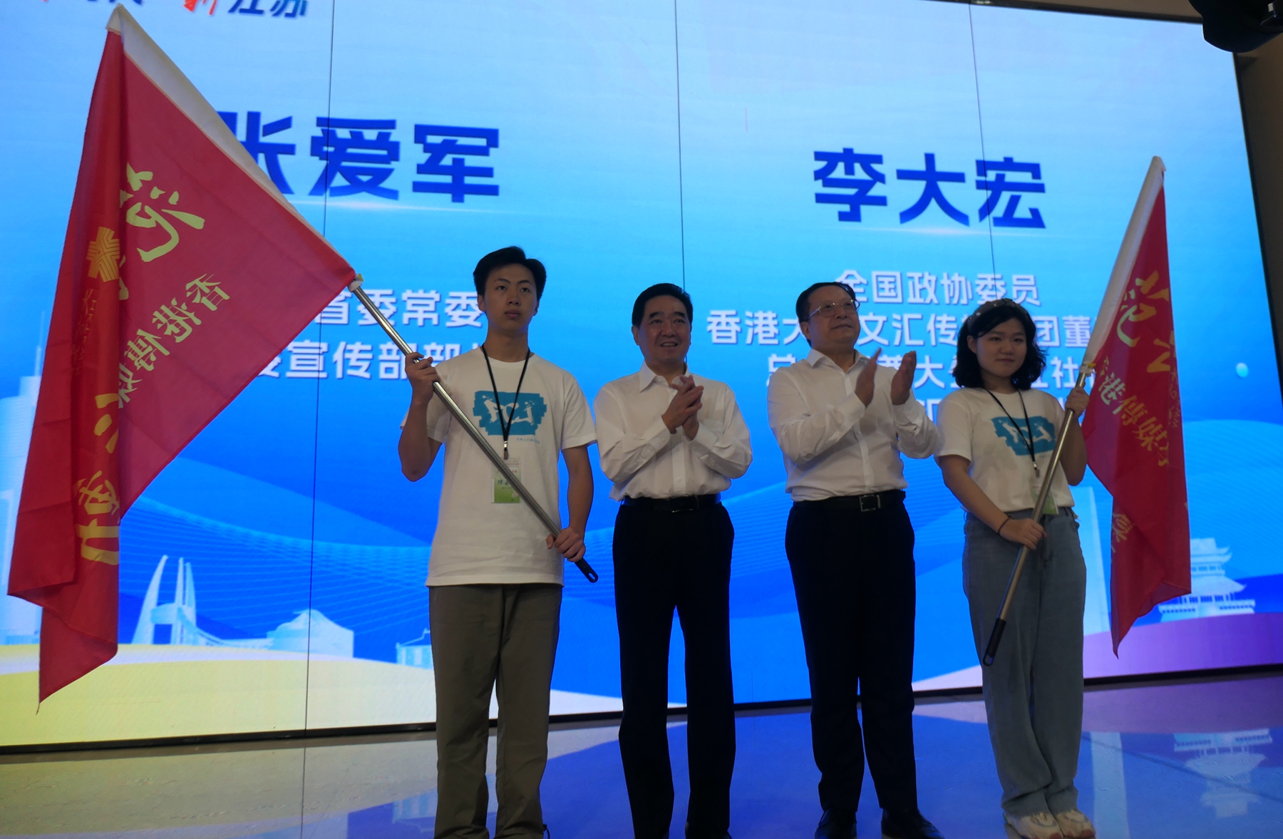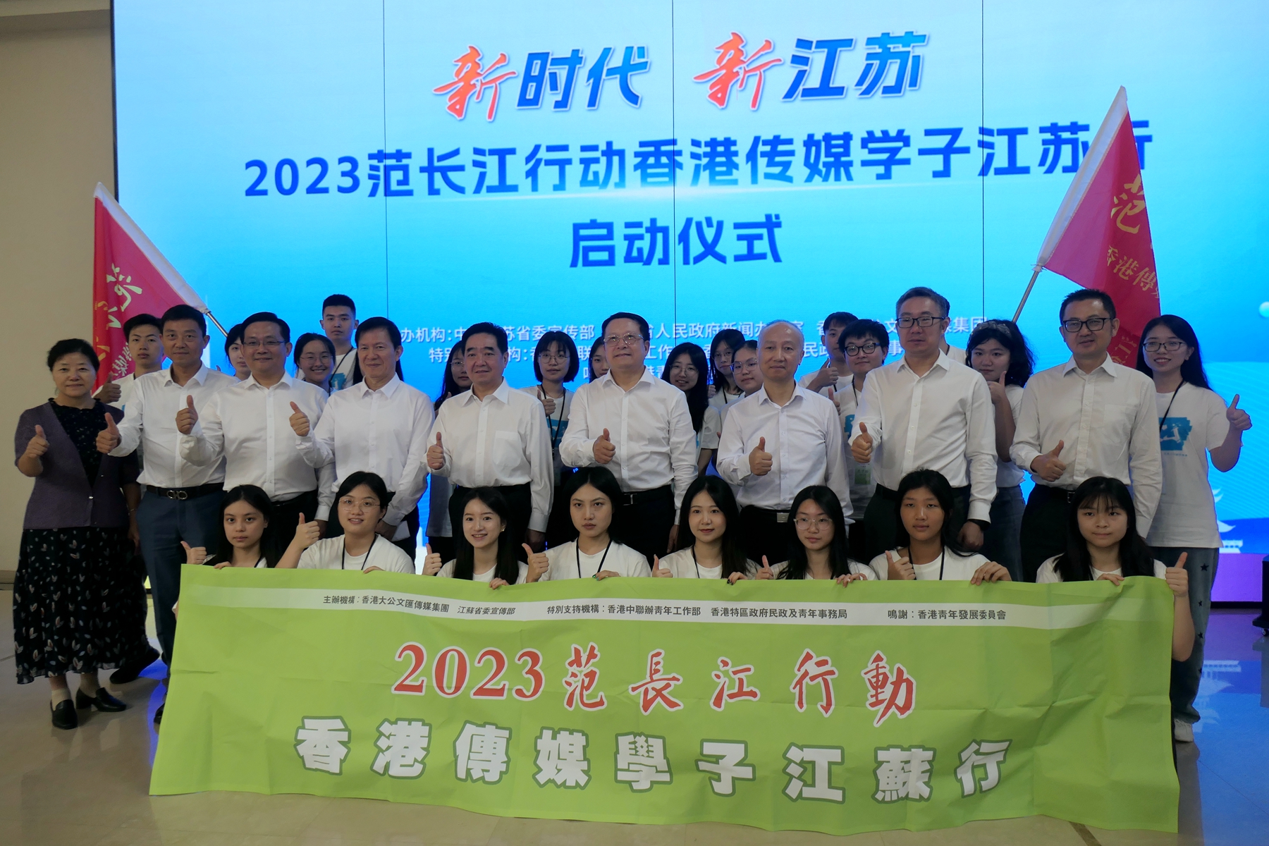 (大公文匯網 記者 賀鵬飛)由香港大公文匯傳媒集團、中共江蘇省委宣傳部、江蘇省人民政府新聞辦公室共同主辦的「新時代 新江蘇——2023范長江行動香港傳媒學子江蘇行」活動,8月9日在南京雞鳴山麓的「世界文學客廳」啟動。來自香港和南京的24名學子將以實習記者身份,實地領略和深入採訪江蘇厚重的歷史文化以及經濟社會發展亮點。江蘇省委常委、省委宣傳部部長張愛軍和香港大公文匯傳媒集團董事長、總編輯兼大公報報社長、香港文匯報社長李大宏為採訪團授旗。