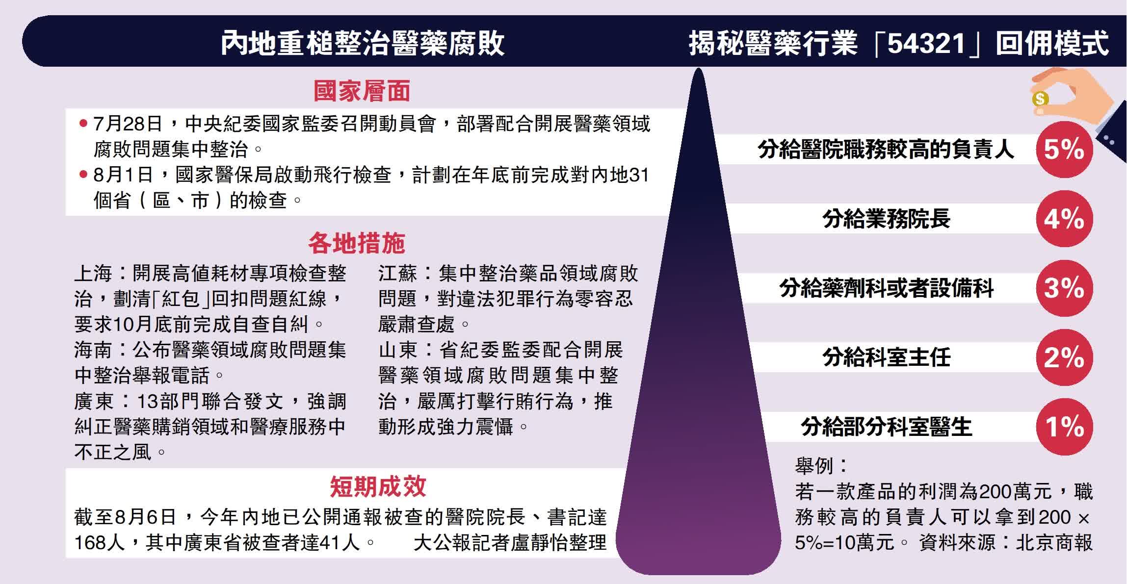 (大公報記者 盧靜怡、李陽波)百餘名醫院院長、書記被查,一台儀器被院長吃掉1600萬回佣……近日,醫藥反腐風暴席捲全國,各地藥企、醫療機構的藏污納垢展現公眾面前。7日,話題「#中紀委曝光一台直線加速器回扣1600萬#」衝上熱搜,各界嘩然。有分析指出,商業賄賂在內地醫藥行業是「公開的秘密」,企業為獲取更高市場份額通過各種渠道向院內「滲透」,與此同時,高額回佣讓供應商、代理商直呼「餵不飽」。截至8月6日,今年內地已公開通報被查醫院院長、書記達168人,其中廣東省被查者達41人。