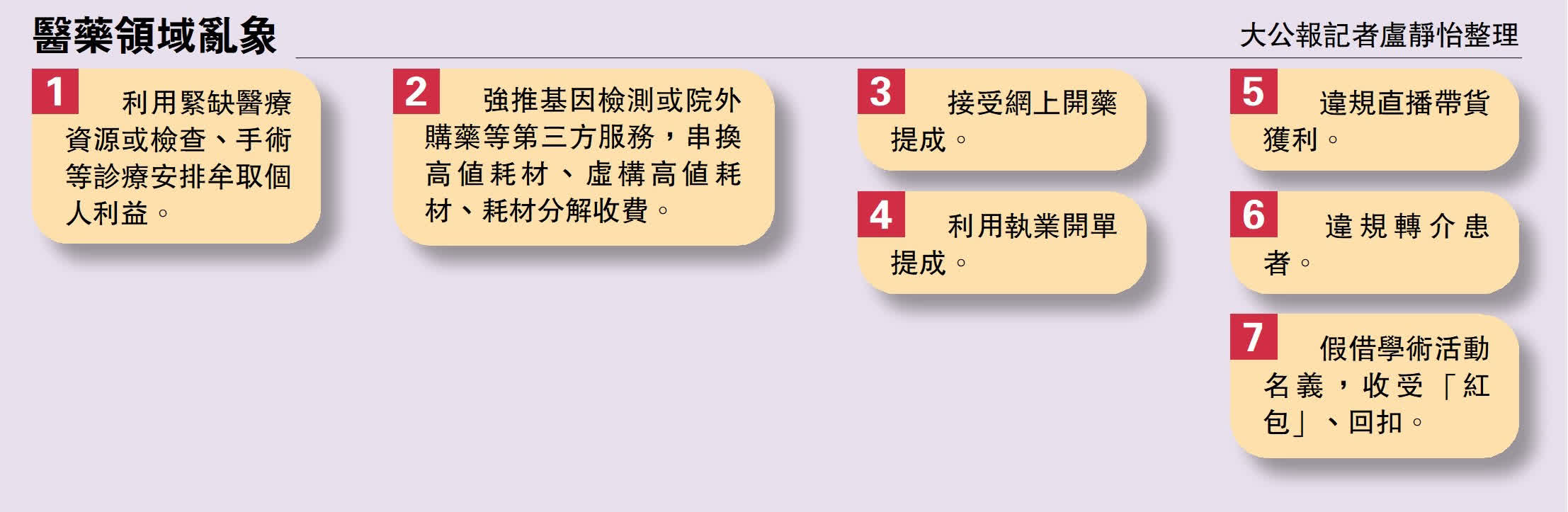 內地醫藥領域頭部企業資深專家段先生9日對大公報表示,近年來,醫療領域的一些頑疾表現尤其突出。比如醫藥企業違規營銷、採購環節吃回扣、診療過程不規範等現象,已經成了行業內「公開的秘密」,不僅嚴重干擾了醫藥行業的良性發展,更讓公眾深惡痛絕。可以說,此次國家重拳出擊,打擊行業腐敗現象,實是勢在必行。
