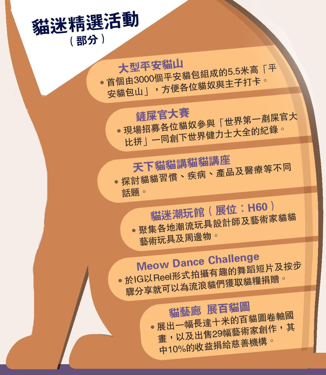 貓迷博覽會不單只有買買玩玩,更有雲集中西藝術作品的貓藝廊,場內聚集潮流玩具的貓迷潮玩館、長達十米的百貓圖卷軸國畫,還有平日各貓奴做慣做熟的「鏟屎官」大賽。