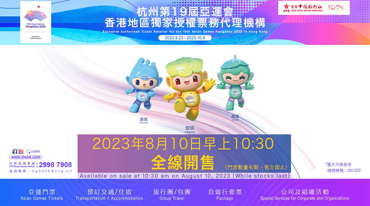 大公文匯全媒體報道,杭州第19屆亞運會將於9月23日至10月8日舉辦。香港中國旅行社有限公司成為杭州亞運會香港地區獨家授權票務代理機構。杭州亞運會要求實名制購票及持已登記旅遊證件入場,且座位由主辦單位安排,不設預先揀位。