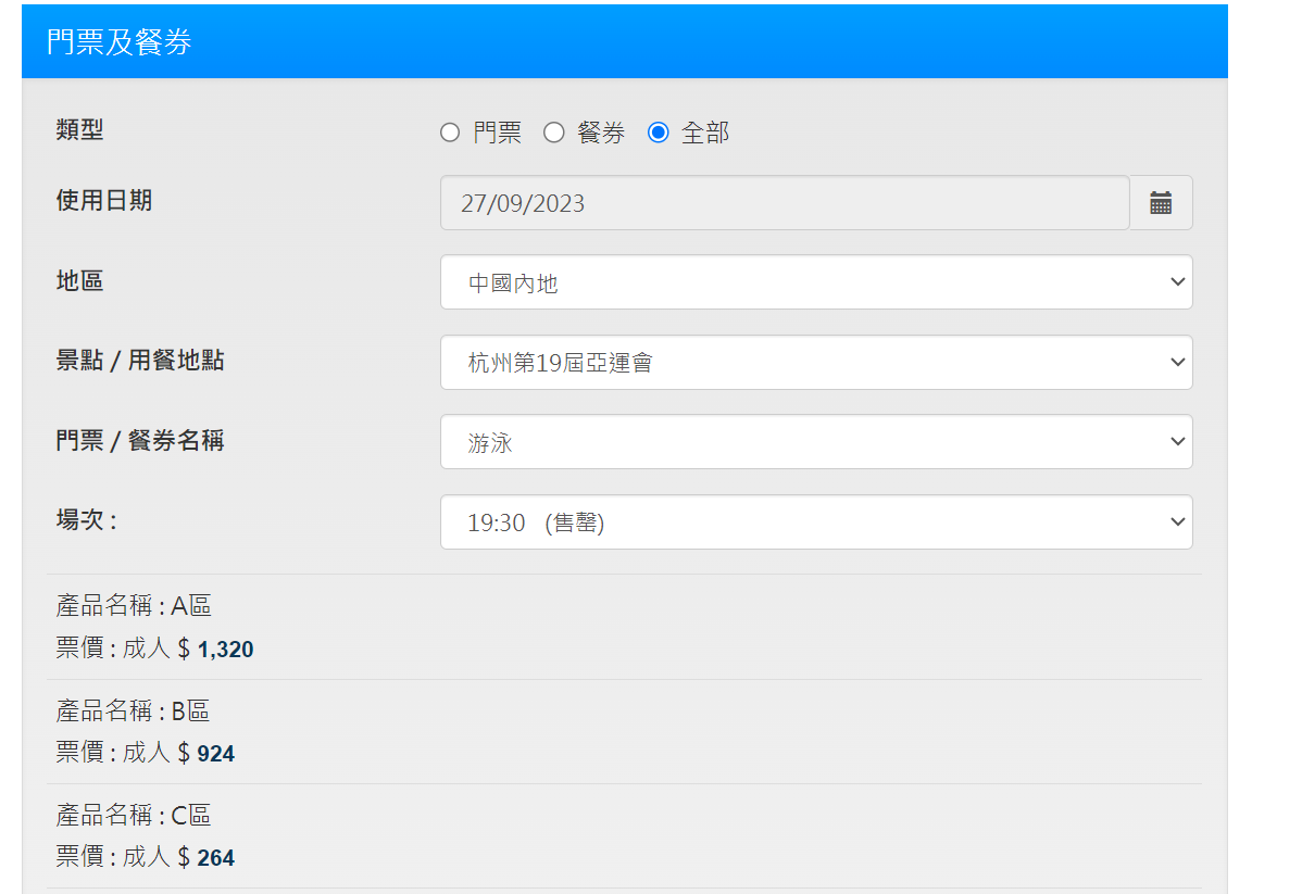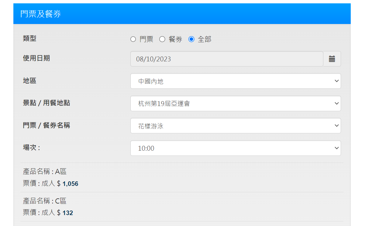 此外,各個項目的門票價格均有所不同,每個項目視觀眾區不同價格也有所不同。例如,10月8日的花樣游泳項目,C區門票價格為132元,A區就是1056港元。