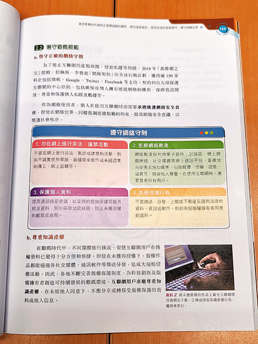 針對使用科技的道德行為操守和資訊素養,在課本加入更多的案例作為參考,讓學生可以更具體、清晰明白箇中的準則和規範,從而培養出相應辨別虛假資訊、正確使用資訊科技的能力和價值觀。