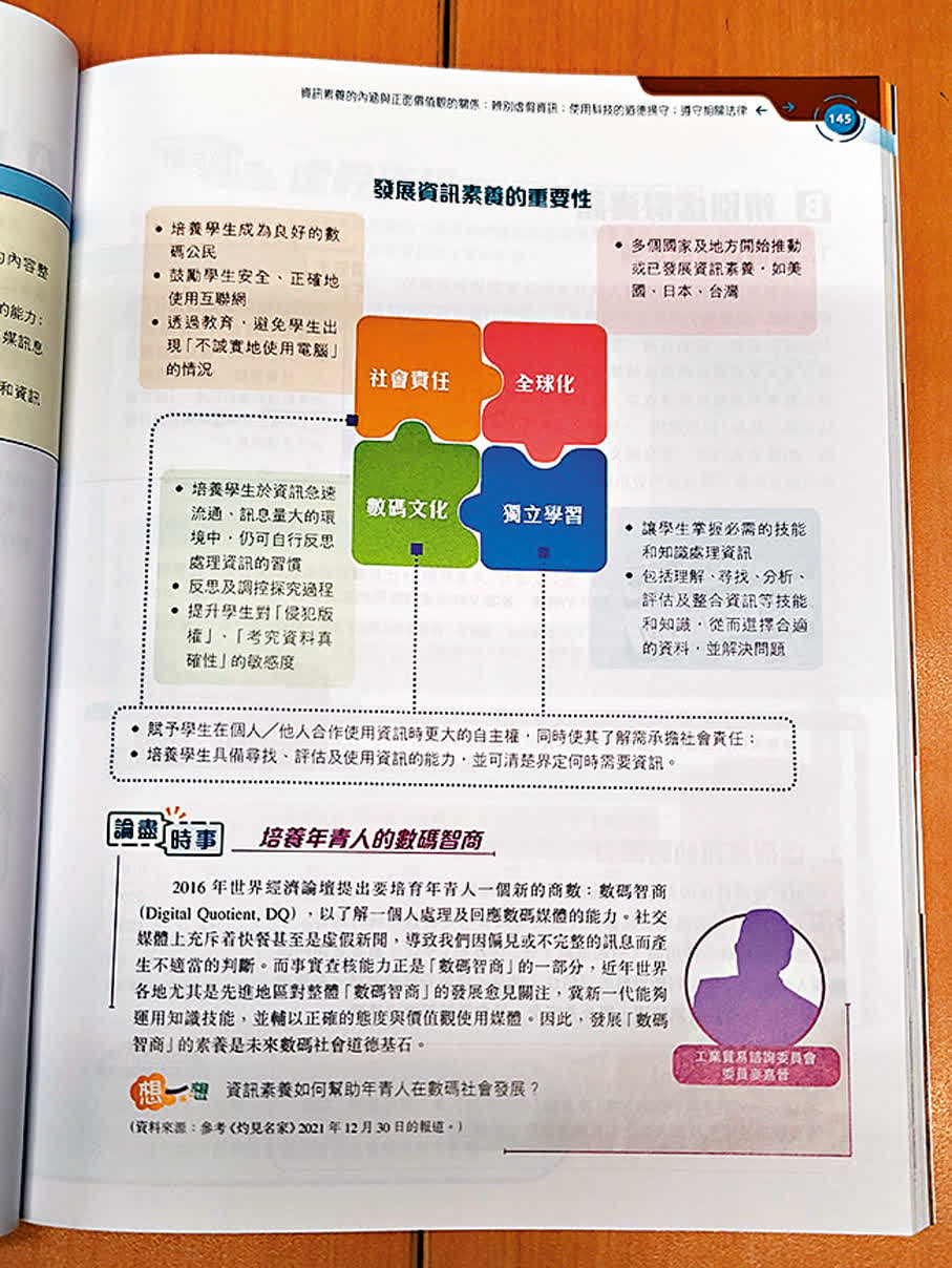 (香港文匯報記者 金文博)香港特區的新高中核心科目「公民與社會發展科」(公民科)即將在9月新學年於中六級首次教授課程主題3「互聯相依的當代世界」,結合已於中四中五級落實的「『一國兩制』下的香港」和「改革開放以來的國家」兩個主題,系統且聚焦地讓全港學生認識及了解香港、國家與世界的密切互動關係和情況,培育他們成為具備國家觀念、香港情懷和國際視野的新一代。香港文匯報記者昨日檢視部分通過教育局評審並已推出市面的教科書,當中涵蓋4個課題,包括日益受關注討論的「科技發展與資訊素養」,除了教導學生全球時代最新的資訊科技發展知識外,也着重培養學生懂得辨別虛假資訊、使用科技的道德操守及遵守法律的內涵與價值觀。