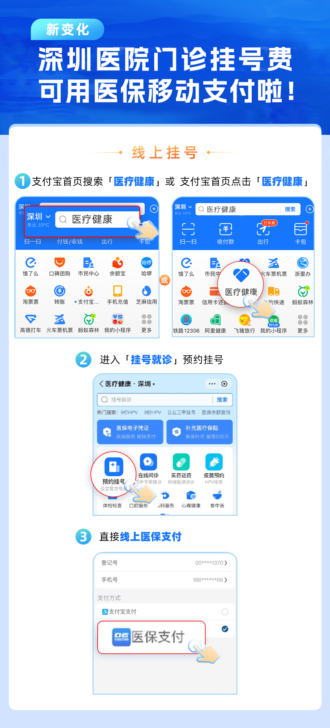 (大公文匯網 記者 郭若溪)挂號費也可以用醫保支付了!記者了解到,即日起,深圳22家醫院的門診挂號、診療費可實現手機醫保移動支付啦。為切實解決群眾就醫繳費排隊時間長、挂號難等問題,深圳市醫療保障局積極推進醫保移動支付工作,參保人員只需打開手機支付寶App,搜索對應醫院小程序,即可通過醫保移動支付完成門診挂號、繳費、報告查詢等實時醫保結算服務。