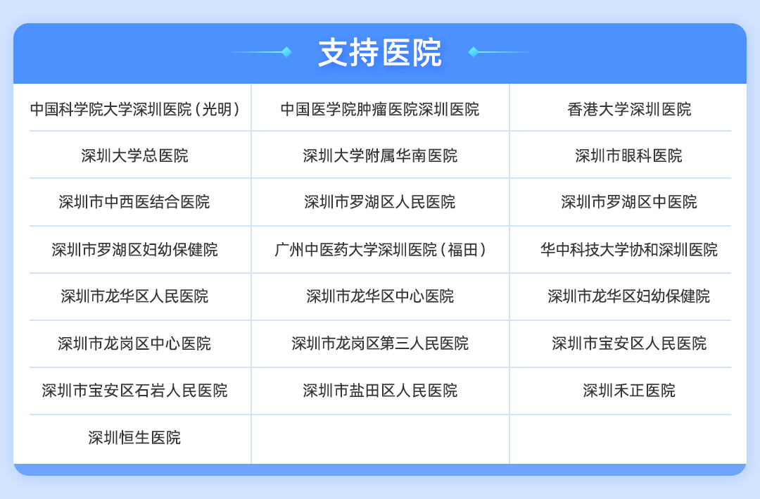 目前,該服務已支持中國科學院大學深圳醫院(光明)、中國醫學科學院腫瘤醫院、香港大學深圳醫院、深圳市眼科醫院等22家醫院,未來還將持續擴大服務範圍。