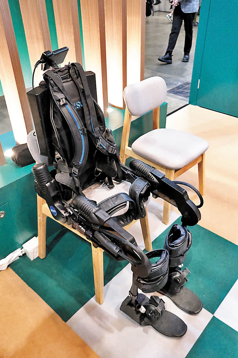 樂齡科技的應用層面廣泛,昨日開幕的黃金時代展覽會展示不少復康產品,其中一款外骨骼機械腳可算是高科技產品,可協助癱瘓患者站立及行走。引入該產品的機構康復經理吳劍青向香港文匯報介紹,外骨骼機械腳用於治療腦創傷、中風、多發性硬化症和脊髓創傷患者,使用該設備能夠讓患者改善步態、獨立活動能力及平衡力等。由於售價不菲,該設備目前正在一些康復中心投入使用。