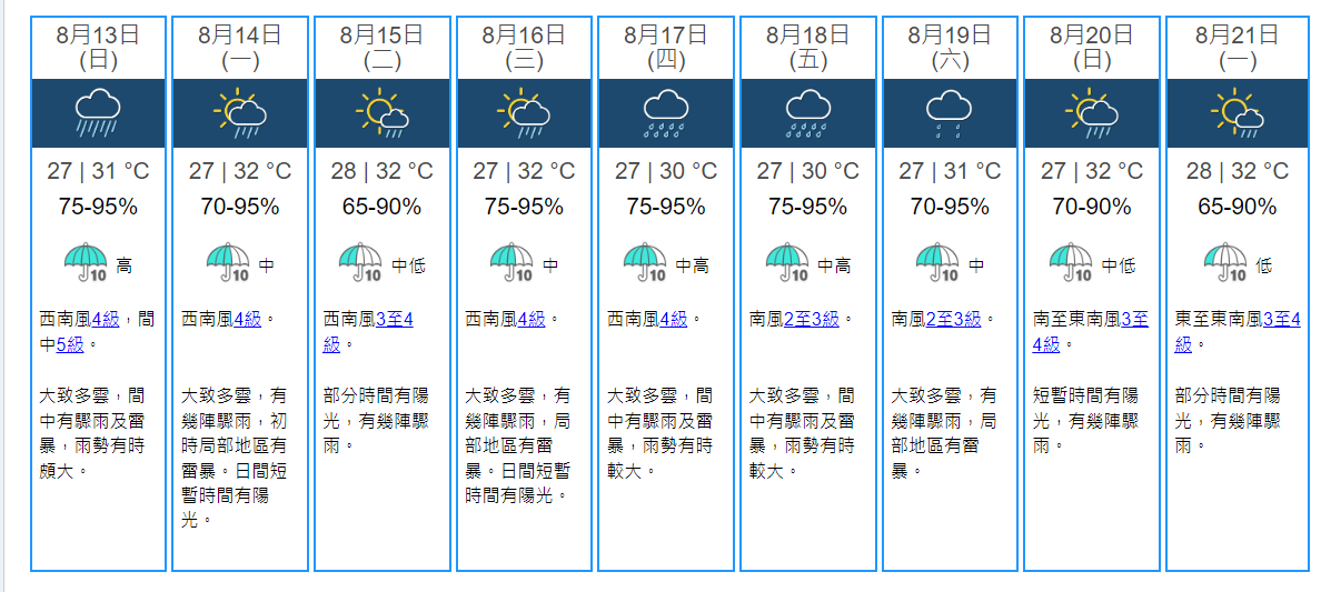 大公文匯全媒體報道,天文台預料下周中至後期受另一道低壓槽影響,華南天氣不穩定。按最新預測,本港明日開始開落足9日雨。
