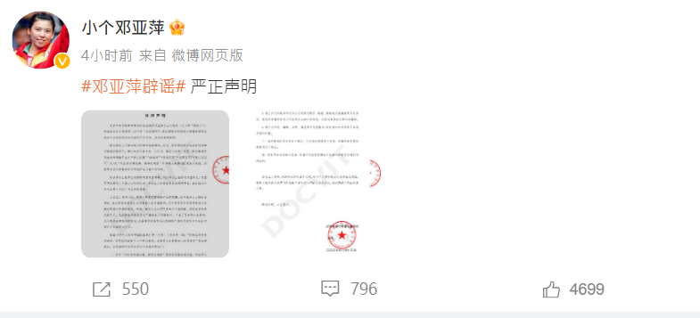 聲明指,近日,某些網絡用戶在沒有任何事實根據的情況下,通過網絡平台以「體壇反腐」「乒乓球」「奧運冠軍」「世界冠軍」「體壇雙冠軍」及/或「鄧亞萍涉嫌貪腐、被帶走調查」等字眼為關鍵詞捏造或以暗指、影射等方式公然散布針對鄧亞萍的不實信息。