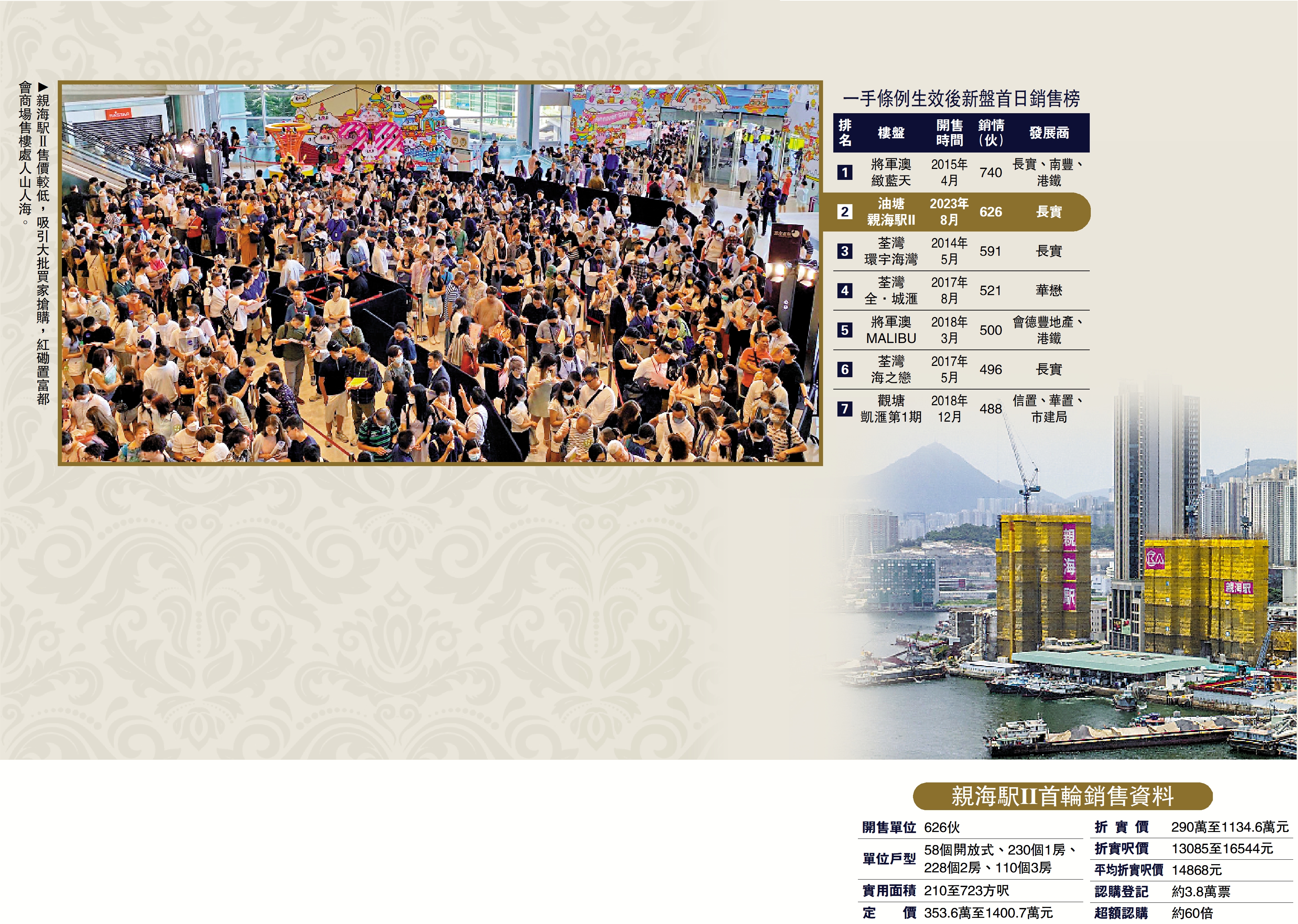 (大公報記者 林志光)長實(01113)在淡市以劈價促銷策略,昨日首輪銷售油塘親海駅Ⅱ的626個單位,吸引超過萬人排長龍認購,不足10小時沽清,成為2013年以來,首日銷售量次高的新盤。樓盤吸引大批年輕買家上車,投資客覷準專才計劃刺激住屋需求而入市,業界估計,買家約40%是此類長線收租客。業界認為,樓盤熱賣,反映市場仍存在大量購買力,且依然看好後市,而在往後的推盤定價上,其他發展商有了一個極重要的參考指標。