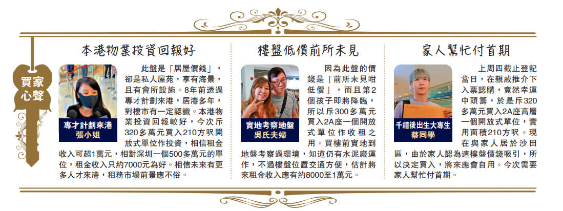 美聯物業住宅部行政總裁(港澳)布少明認為,樓盤低價推售引出大批購買力,更估計收租客所佔比例高達40%,預計該盤將來的租金回報率可達3厘。