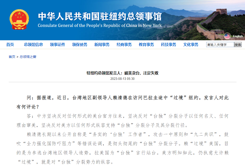 大公文匯全媒體報道,據報道,中國台灣地區副領導人賴清德8月12日出發赴巴拉圭出席巴總統就職典禮,目前已抵達美國紐約「過境」。中國駐紐約總領館發言人今日(13日)表示,中方堅決反對任何形式的美台官方往來,堅決反對「台獨」分裂分子以任何名義、任何理由竄美,堅決反對美方以任何形式縱容支持「台獨」分裂分子及其分裂行徑。