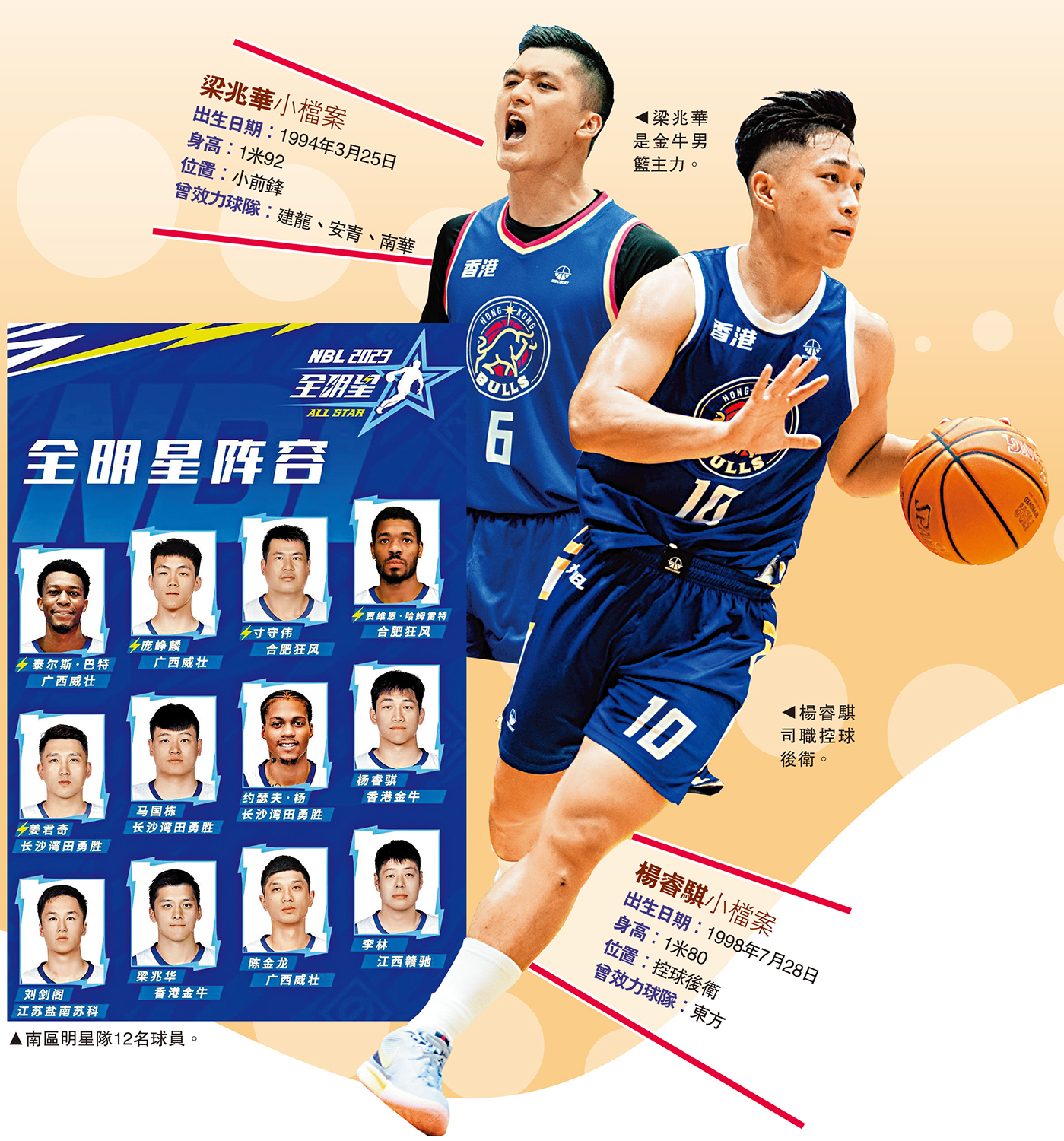 (大公報記者 張銳)全國男子籃球聯賽(NBL)全明星周末將於本周六及周日在雲南省紅河州彌勒市舉行。香港金牛隊主力梁兆華和楊睿騏入選南區明星隊,成為首兩位出戰NBL明星賽的香港球員。