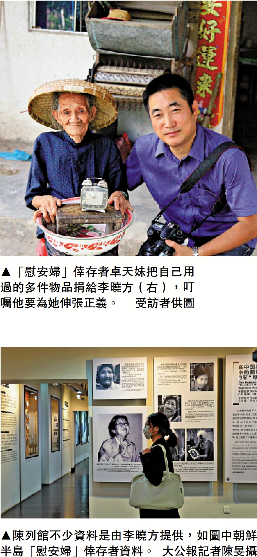 (大公報記者 陳旻)位於南京利濟巷2號的南京利濟巷慰安所舊址陳列館(下稱:陳列館)是經由在世「慰安婦」倖存者指認、亞洲現存規模最大的日軍慰安所舊址,館內展出的400多塊圖板共680多幅照片中,200多幅圖片、大量文字與多項學術成果為侵華日軍暴行獨立調查研究學者李曉方原創拍攝與提供。8月14日是第11個世界「慰安婦」紀念日,李曉方對大公報表示,該陳列館內展陳了他自費在內地各省市及韓國、日本對日軍從軍「慰安婦」受害倖存者進行田野調查的成果,他以長達十年的業餘時間艱難尋訪了100多位中外倖存「慰安婦」受害者,目的是永久留下作為戰爭受害者的女性屈辱史,「不能讓侵略者掩蓋那彌天大罪,要讓世人都知道人類歷史上這黑暗的一頁。」