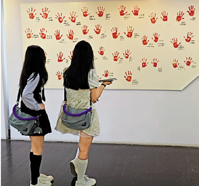 陳列館A區《二戰中的性奴隸──日軍「慰安婦」制度及其罪行展》中,證人證言展區,一面手印牆觸目驚心,43個血紅手印背後是22位「慰安婦」的屈辱血淚史。這面手印牆是李曉方特別為中國「慰安婦」們留下的永久歷史見證。