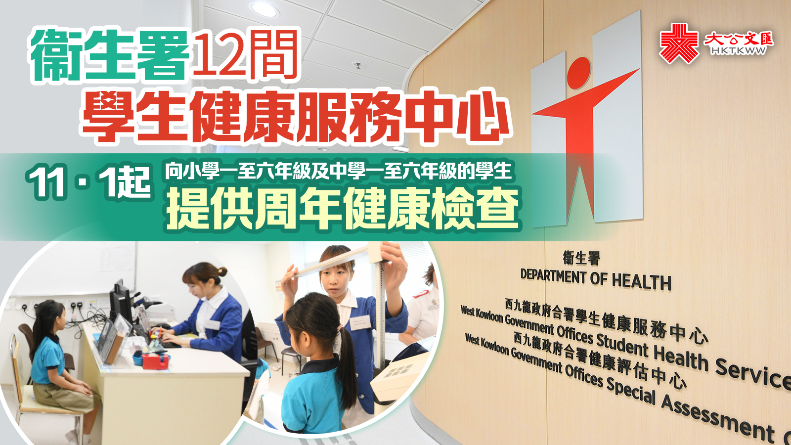 大公文匯全媒體報道,衞生署今日(14日)宣布,轄下12間學生健康服務中心於今年11月1日起,向小學一至六年級及中學一至六年級的學生提供周年健康檢查服務。另外,原於九龍城獅子會學生健康服務中心接受服務的中小學生,會獲安排前往西九龍政府合署學生健康服務中心接受服務。
