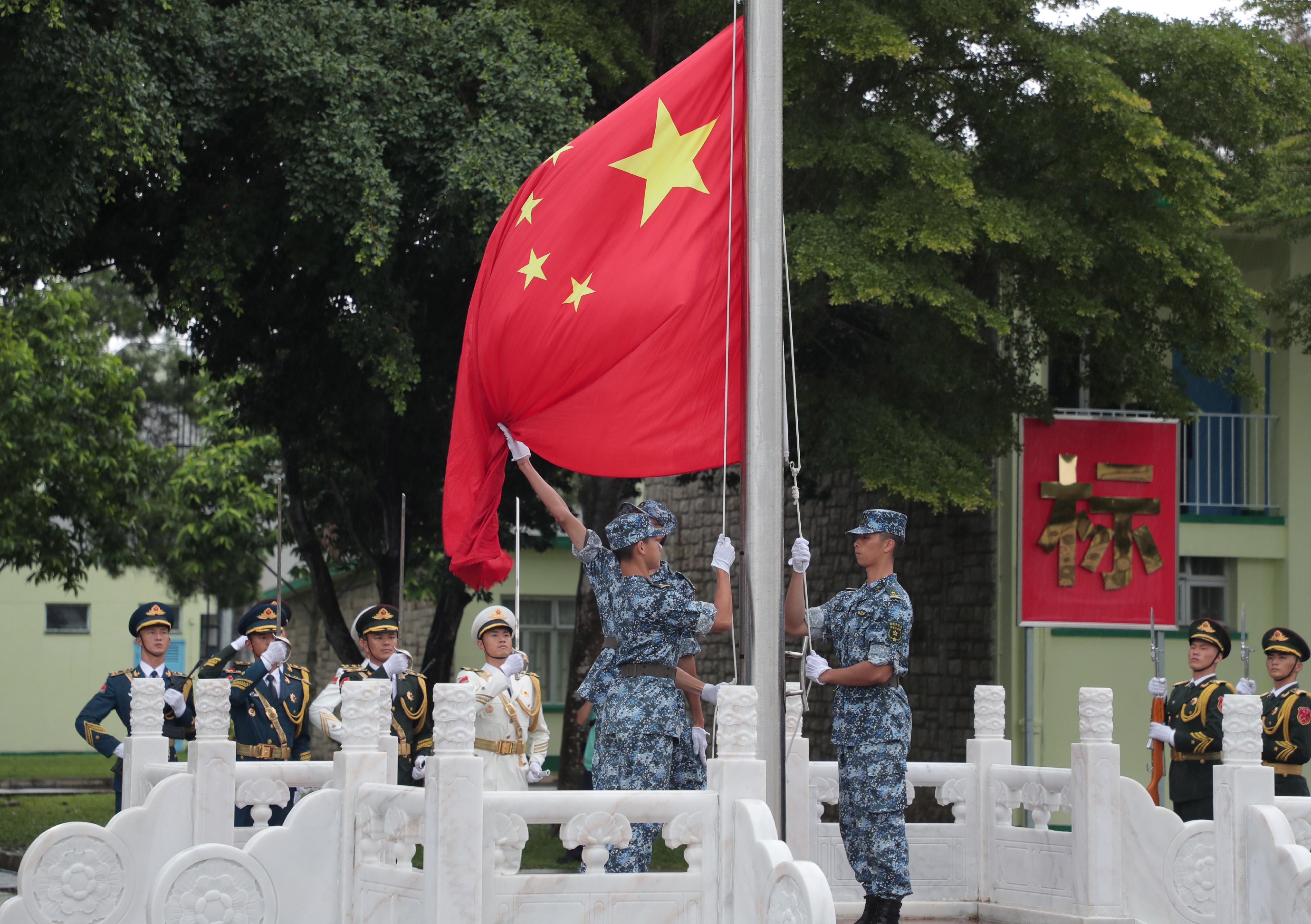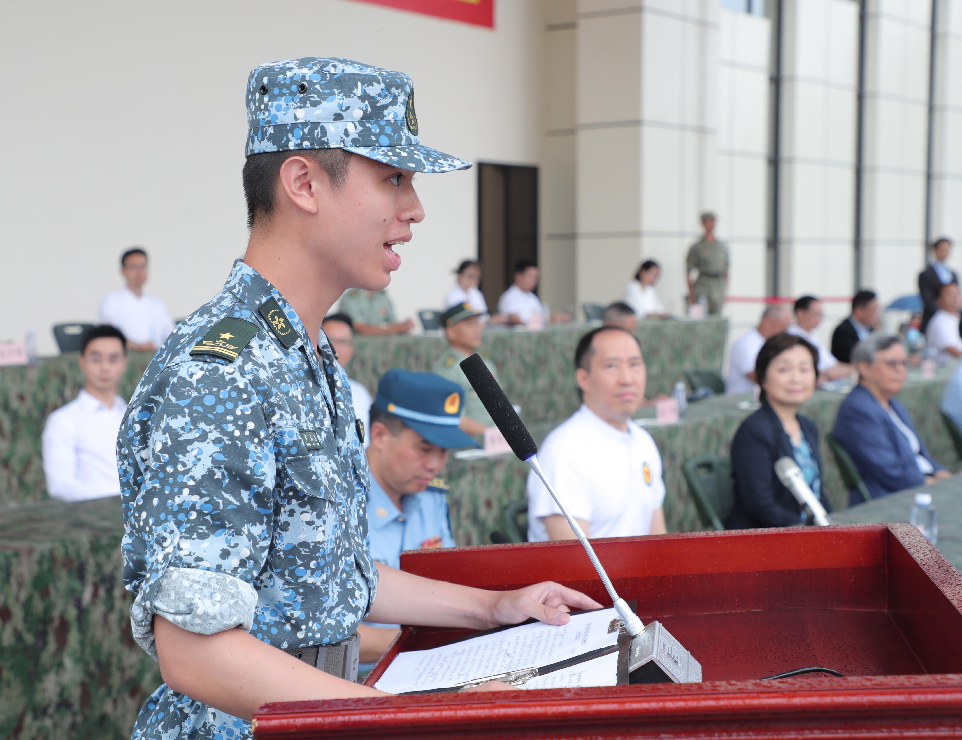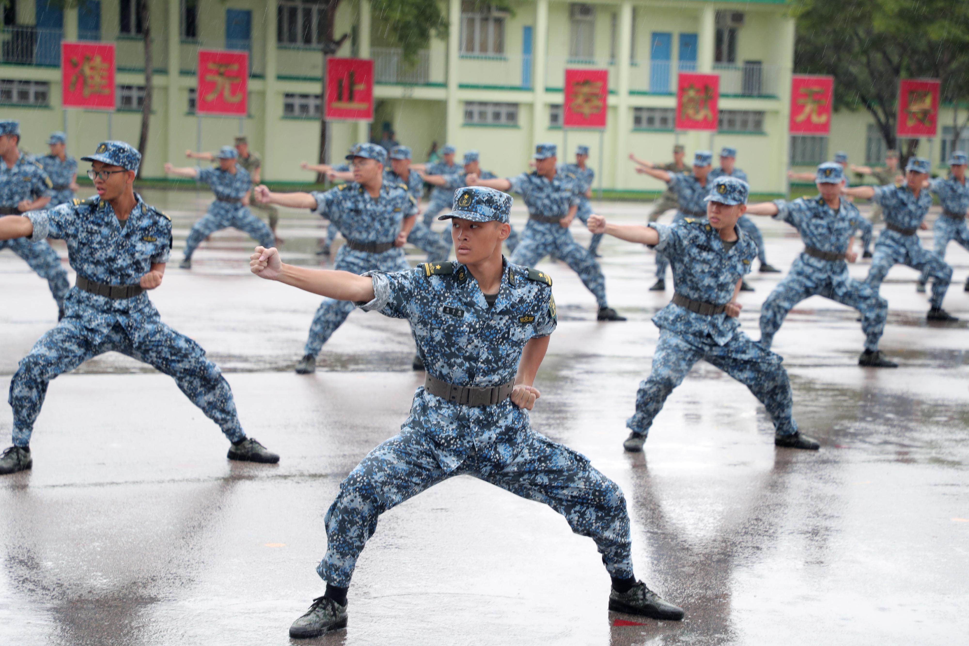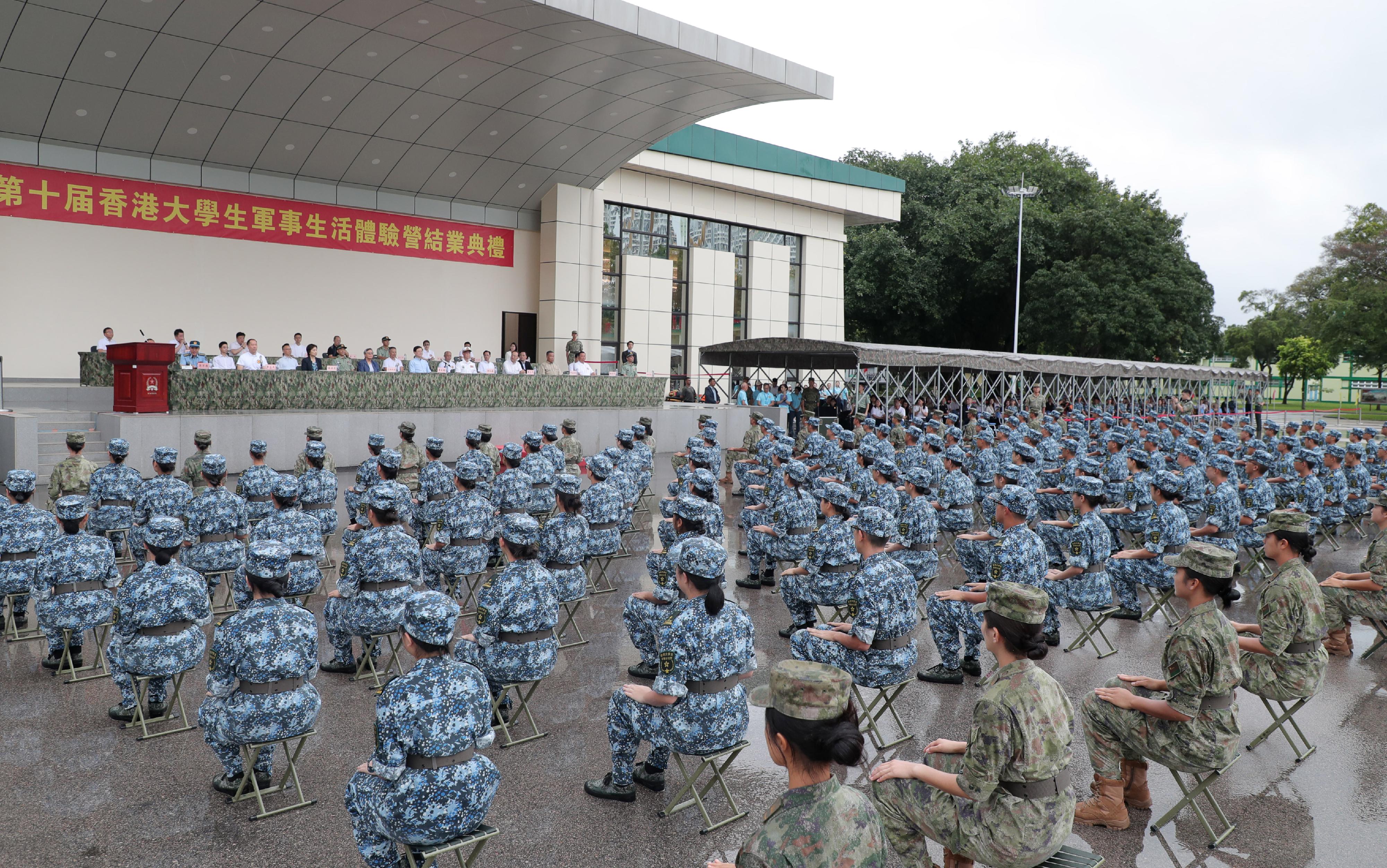 結業典禮上,150名香港大學生整齊列隊、精神抖擻,在雄壯的國歌聲中,隆重舉行莊嚴的升國旗儀式。升國旗儀式結束後,大學生們進行了軍體拳表演,以熟練的動作和昂揚的氣勢展示軍事生活體驗營訓練成果。各方代表分別致辭後,主禮嘉賓為學生代表頒發結業證書。最後,大學生們和駐軍官兵合唱《歌唱祖國》並合影留念,至此,本次軍事體驗營畫上了圓滿的句號。