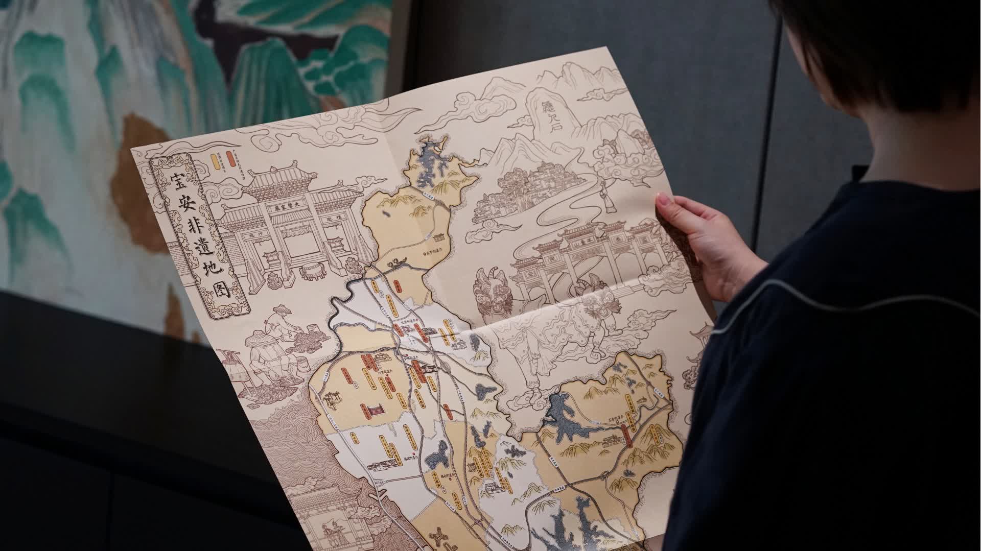 據了解,地圖由設計師歷時100餘日精心繪製,描繪了上川黃連勝醒獅舞(國家級)、沙井蚝生產習俗(省級)、西鄉北帝廟三月三廟會(省級)等11項寶安本土非遺代表性項目與地圖組合而成,繪畫生動有趣,令人耳目一新。