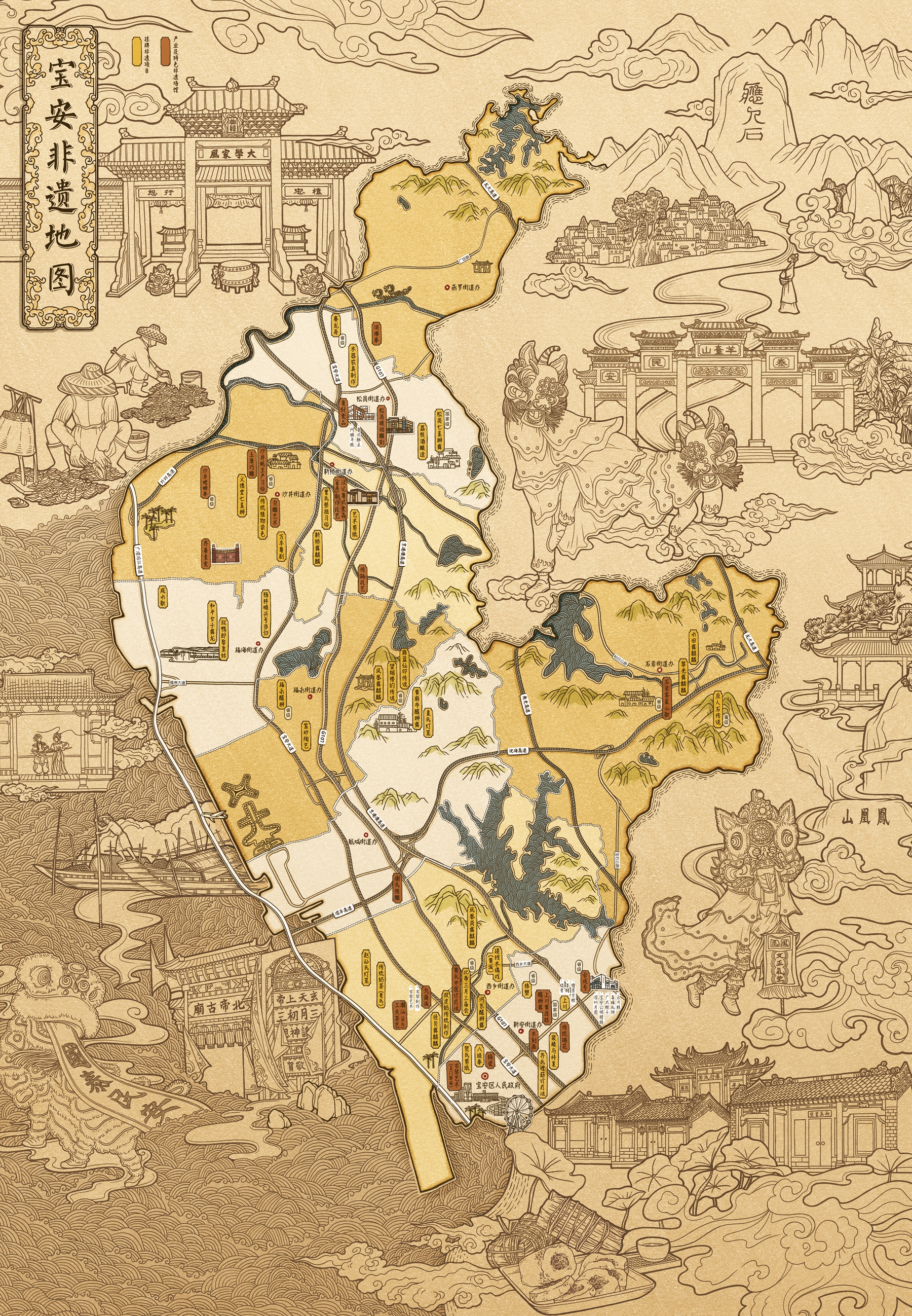 (大公文匯網記者 石華)近日,由深圳市寶安區文化館製作的寶安首張手繪《寶安非遺地圖》正式發布,地圖全面展示寶安區各街道非遺項目、非遺特色場館及產業,方便市民、遊客和非遺愛好者通過地圖更加有趣、直觀的了解寶安非遺文化。