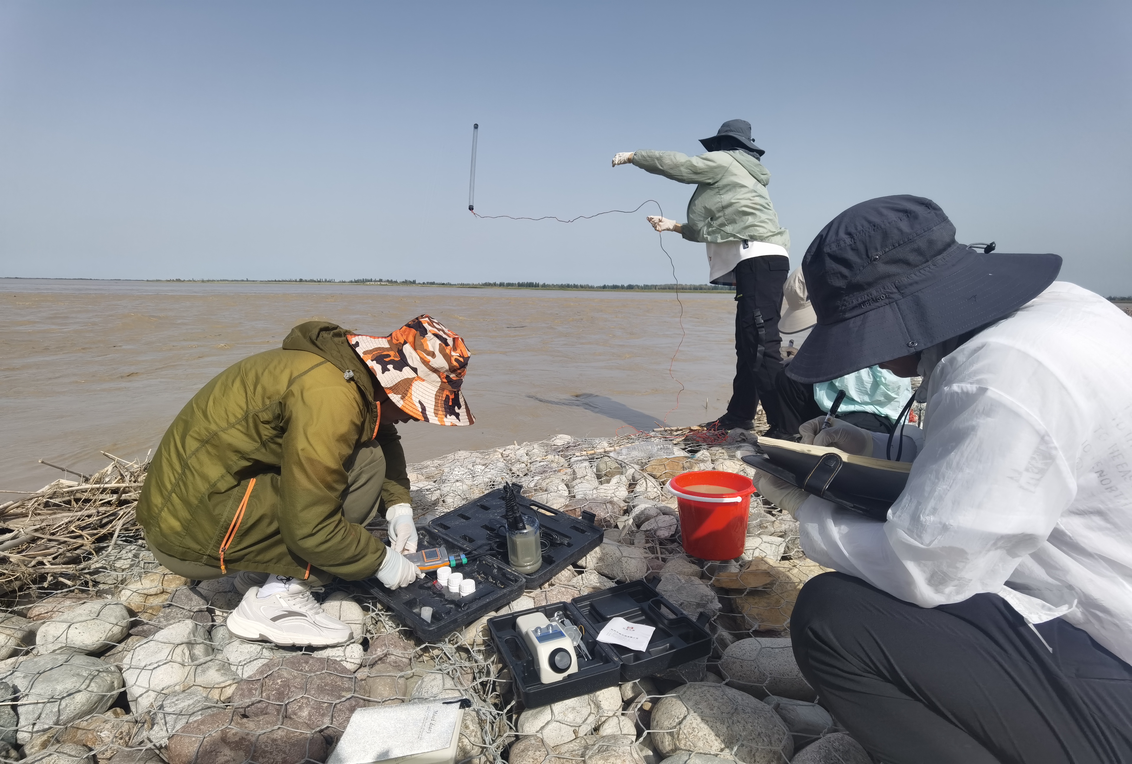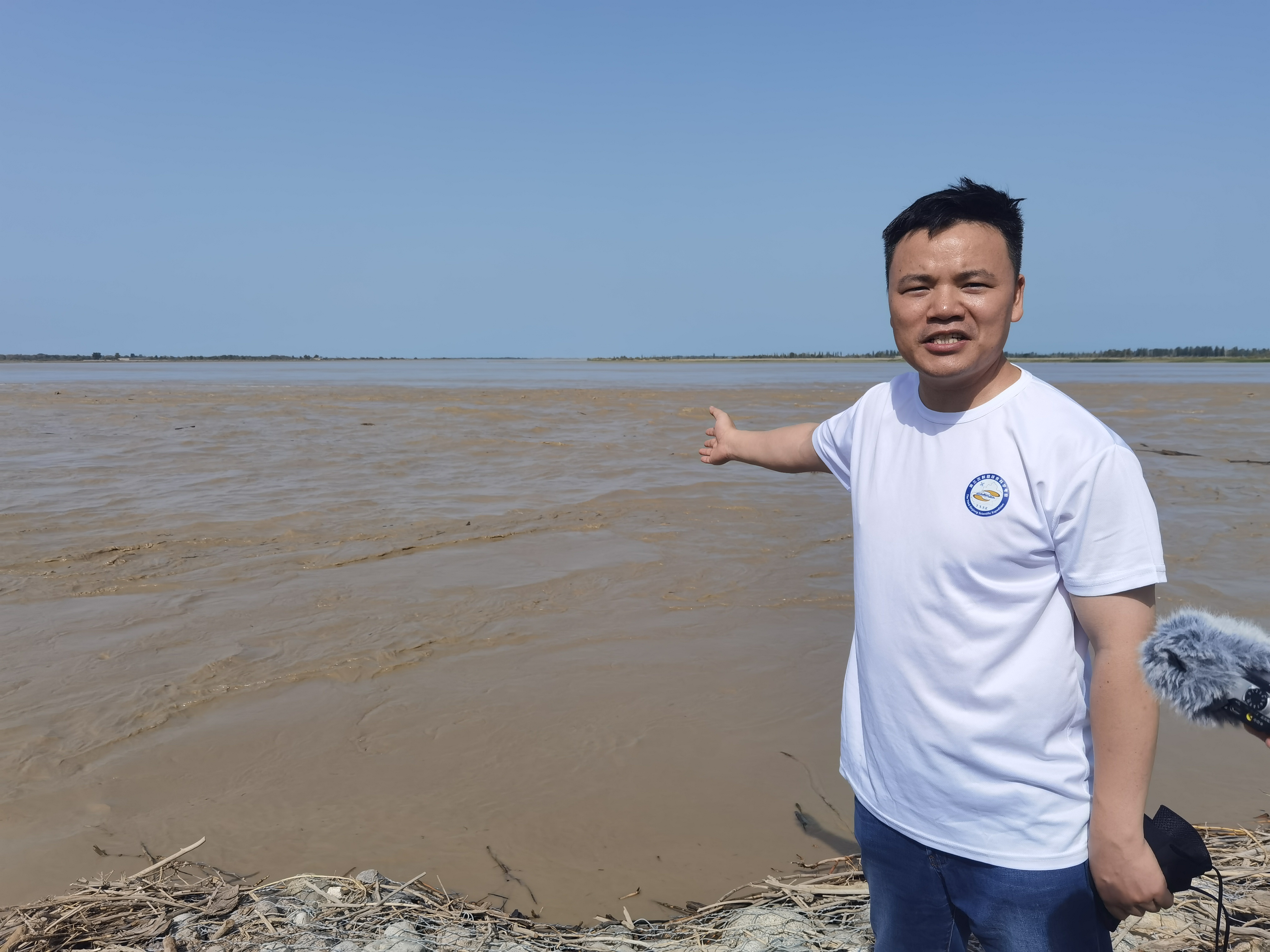 塔里木河是中國最長的內陸河,被稱為南疆的母親河,由阿克蘇河、葉爾羌河和和田河匯流而成。站在三河匯合處肖夾克的岸邊,舉目遠望,河面寬闊,水量豐沛。幾位科技人員正使用儀器收集水文信息,為塔里木河流域產∕需水要素變化與水安全格局的調查貢獻數據。