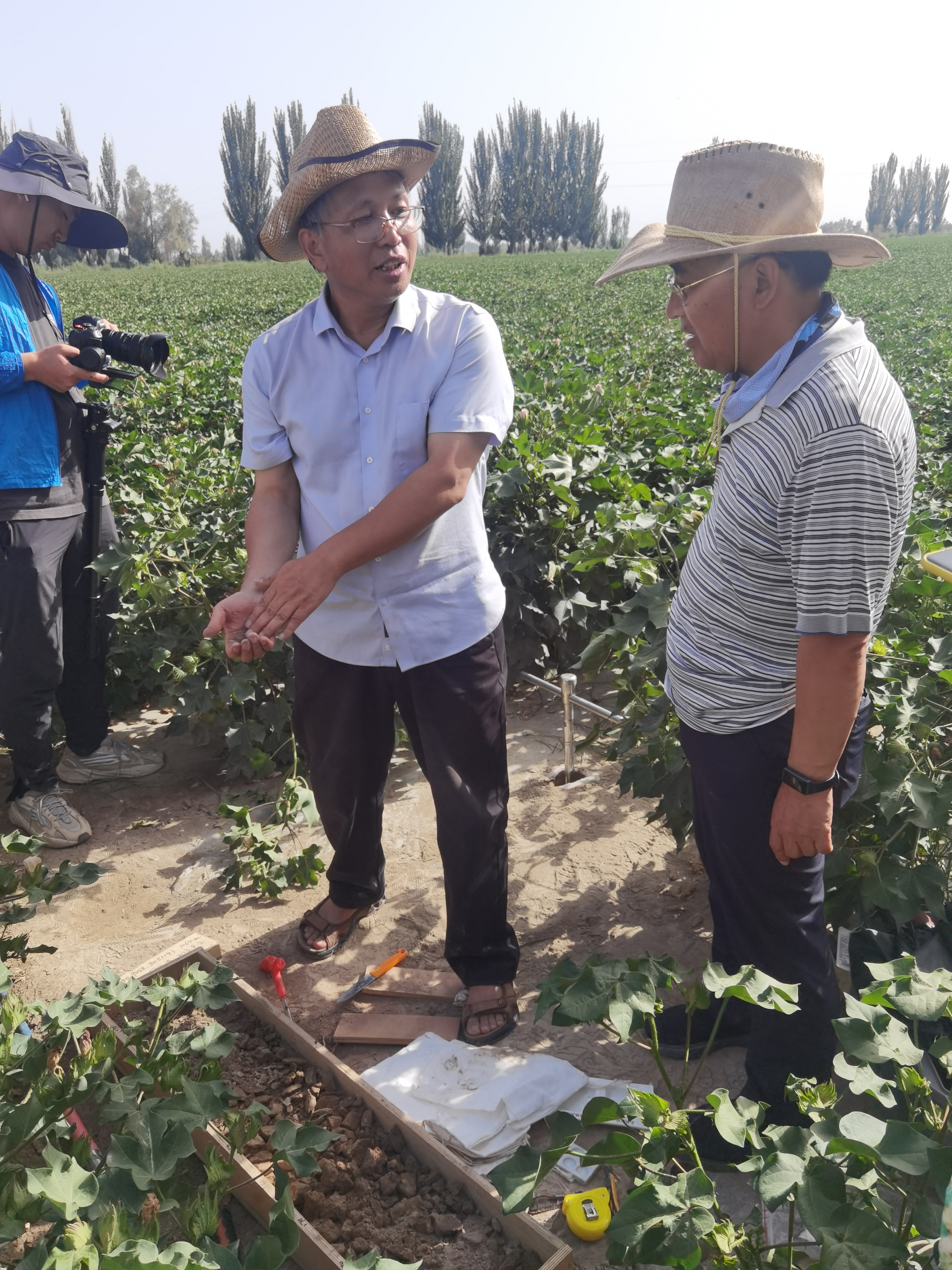 阿克蘇的一處棉田裏,淡黃的花朵掩映在大片深綠枝葉中。來自中國農業科學院農業資源與農業區劃研究所研究員龍懷玉正帶領團隊在田間採集土壤樣本,開展塔河流域土地開發與農業資源調查。這位專家告訴記者,他們正在考察新疆農業布局優化的可能性。調查發現,新疆高耗水作物比較多,不適合種水稻的地方在種水稻,不適合種棉花的在種棉花;灌溉模式單一,滴灌不夠精準,水資源利用效率不高。「今後可採用我們自主研發的地下散灌、乾播濕出等技術,既可以節水20-30%,也可解決鹽鹼化問題。目前,埃及等國家也在學習我們這個技術。」