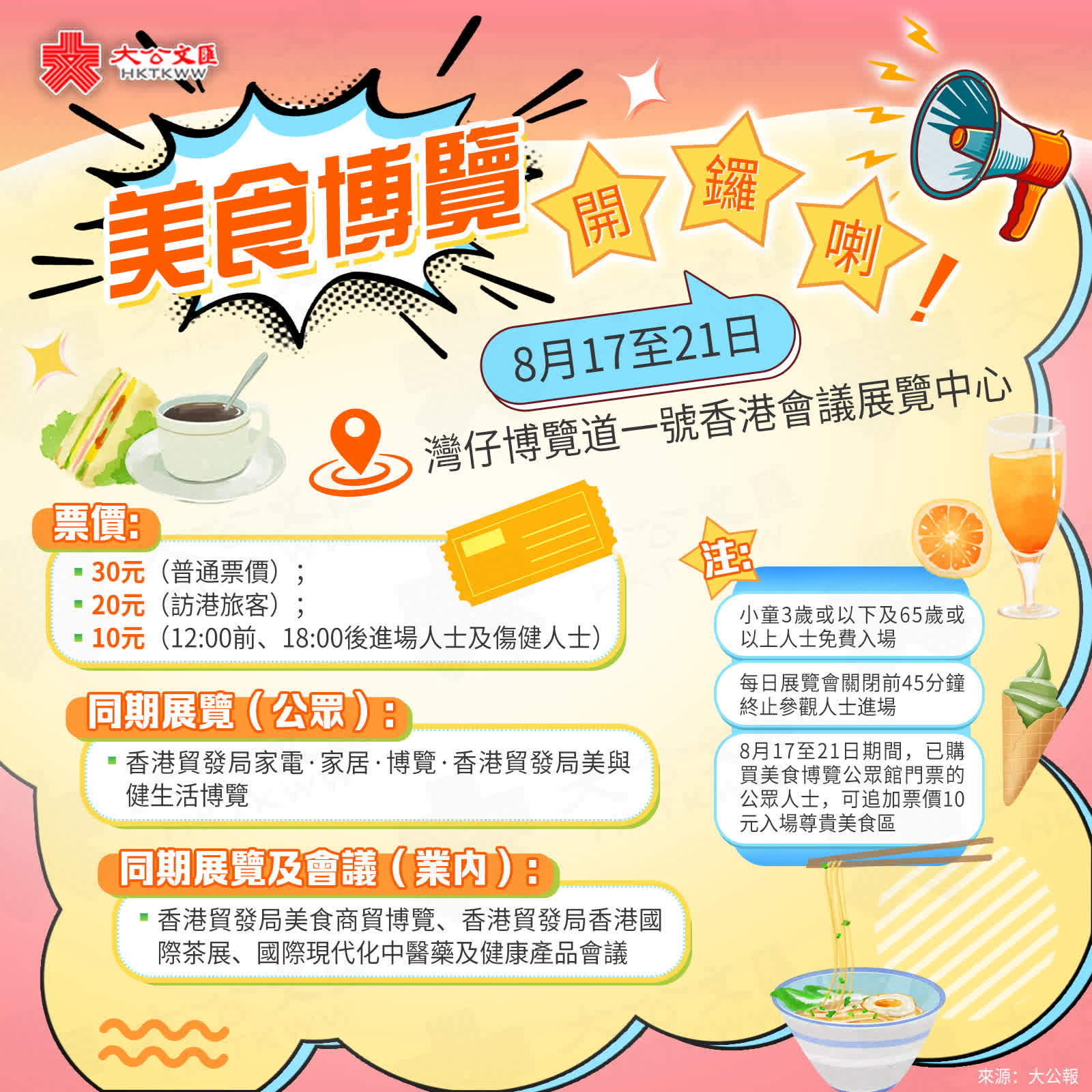今屆美食博覽將連同家電·家居·博覽、美與健生活博覽,今天起一連五日在香港會議展覽中心舉行,同場還有「美食商貿博覽」及「香港國際茶展」。五項展覽合共吸引超過1,700間展商參與,主辦方期望五大展覽入場人流多於去年四大展覽的43萬人次。