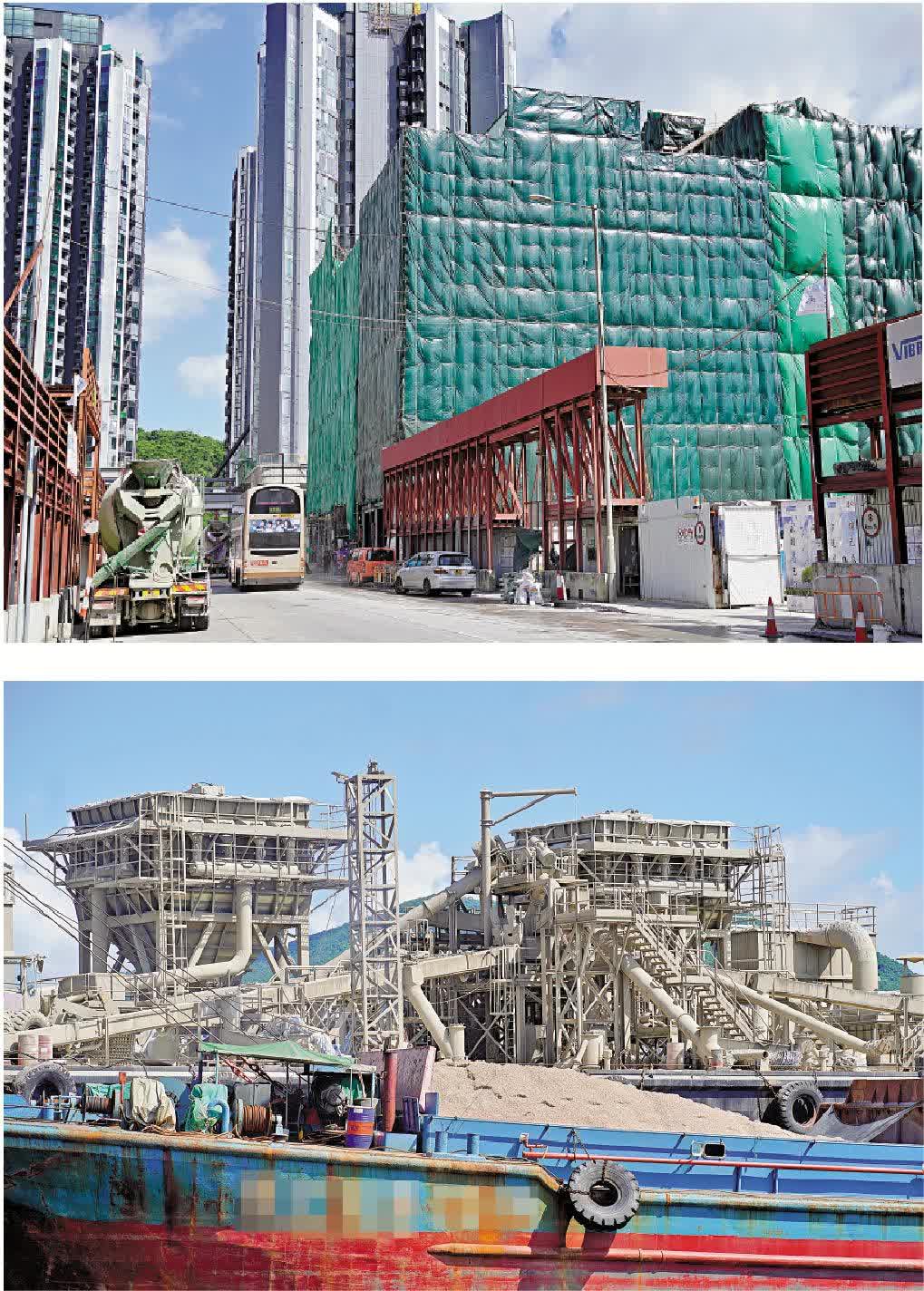 位於油塘東源街的20和22號混凝土廠由中國混凝土有限公司營運。記者上周一(7日)到場觀察,見混凝土廠仍在運作。全棟廠房上月以綠色帆布遮蓋,現時則更換成藍色帆布,現場有工人還在高空棚架上布置。廠房的出車口安裝了噴霧器,在行車繁忙時段,廠房會安排至少兩名工人拿着水喉,每當有車輛經過,就向路面噴水,以減少灰塵揚起。雖然噴水確實減少塵埃飛揚,如有雙層巴士和急速駛過的混凝土車,仍能看到一定程度的灰塵揚起。廠房海旁停泊至少兩艘運沙船,船上的沙有帆布遮蓋。岸邊的釣客黃先生說,自己是附近住戶,不時會到廠房旁的岸邊釣魚,「玩下無所謂,釣上來又放生,肯定不會吃。」他認為,廠房附近確實有不少環境問題,但這一帶是工業區,崇山街及四山街的車房和廠房更吵更髒。「要在工業區置業,有沒有混凝土廠其實都是一樣吵,一樣多塵。」