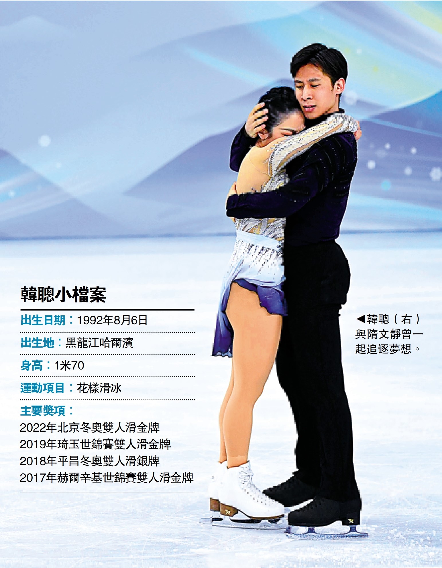 韓聰去年9月被國際滑冰聯盟正式任命為單雙人滑技術委員會運動員委員。2022年2月奪得北京冬奧雙人滑金牌時,他和小他3歲的隋文靜已經搭檔15年,除奧運金牌外,兩人還攜手獲得兩屆世界錦標賽冠軍。