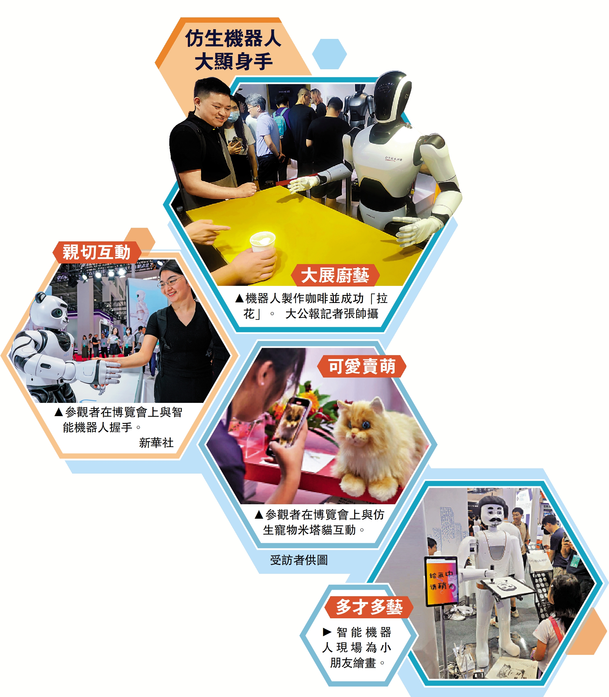 (大公報記者 張帥)2023世界機器人大會8月16日至22日在京舉辦,140多間國內外機器人企業攜近600件展品亮相展會,全球首發新品60款居歷屆之最。「李白」「杜甫」吟詩對話,機器人寵物貓陪護老人、小孩……仿生機器人在今年展會上同場競技,各顯神通。大公報現場採訪獲悉,隨着技術進步,國產AI算力不斷提升,仿生機器人外觀更逼真,與觀眾互動更靈活、人性化,成本不斷下探,正加速落地使用。在展會上,「機器人+」製造業、農業、醫療健康等應用場景悉數呈現,展示最新創新科技成果。