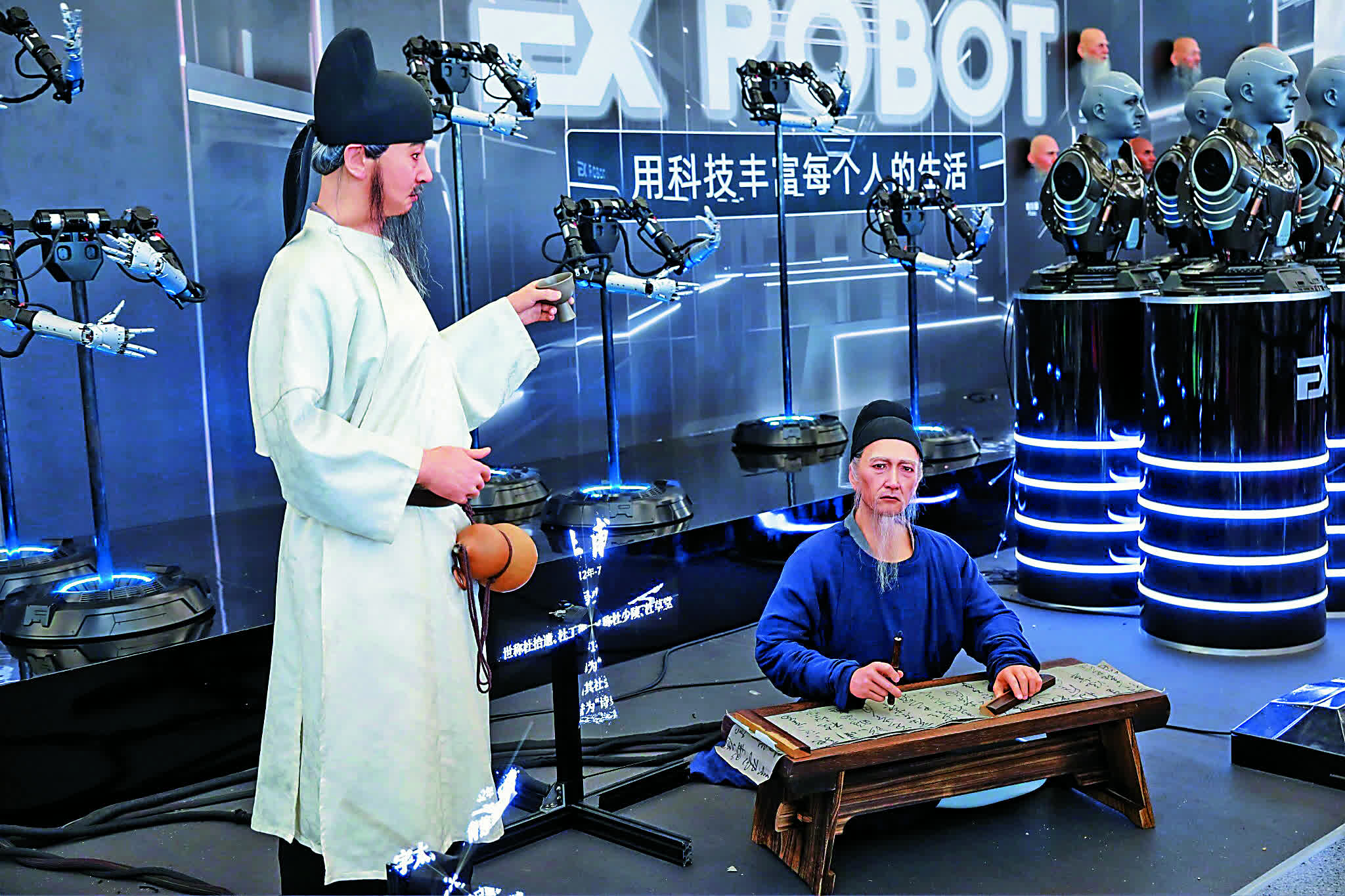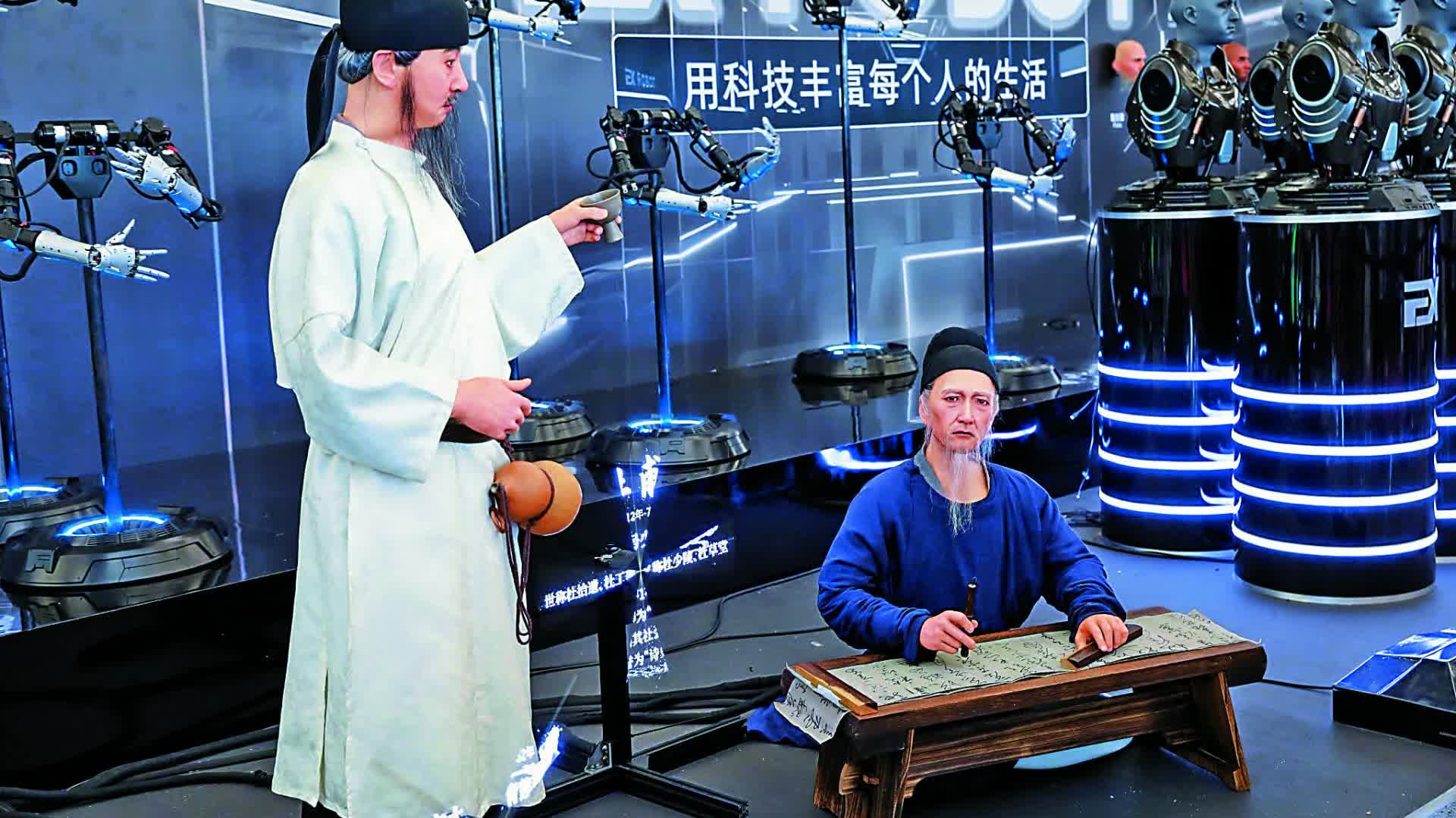 今年夏天爆火的動畫電影《長安三萬里》,揭秘了詩仙李白的傳奇人生。「君不見,黃河之水天上來……」走進世界機器人大會A館序廳,循聲望去,可以看到與李白本人一比一的仿生人形機器人正舉着酒杯慷慨激昂地吟詩。「好詩!太白兄!」在李白的旁邊,杜甫則正伏案書寫,動態逼真,吸引前來打卡的觀眾絡繹不絕。「杜甫和李白是今年的新面孔,這兩個智能仿生機器人可以彼此互動,更具趣味性。」工作人員表示,通過升級應用仿真技術,公司多款人形機器人的皮膚質感、外觀變得更加逼真。新一代柔性執行器的升級換代使機器人動作更為柔性化,不斷接近真人活動的效果。