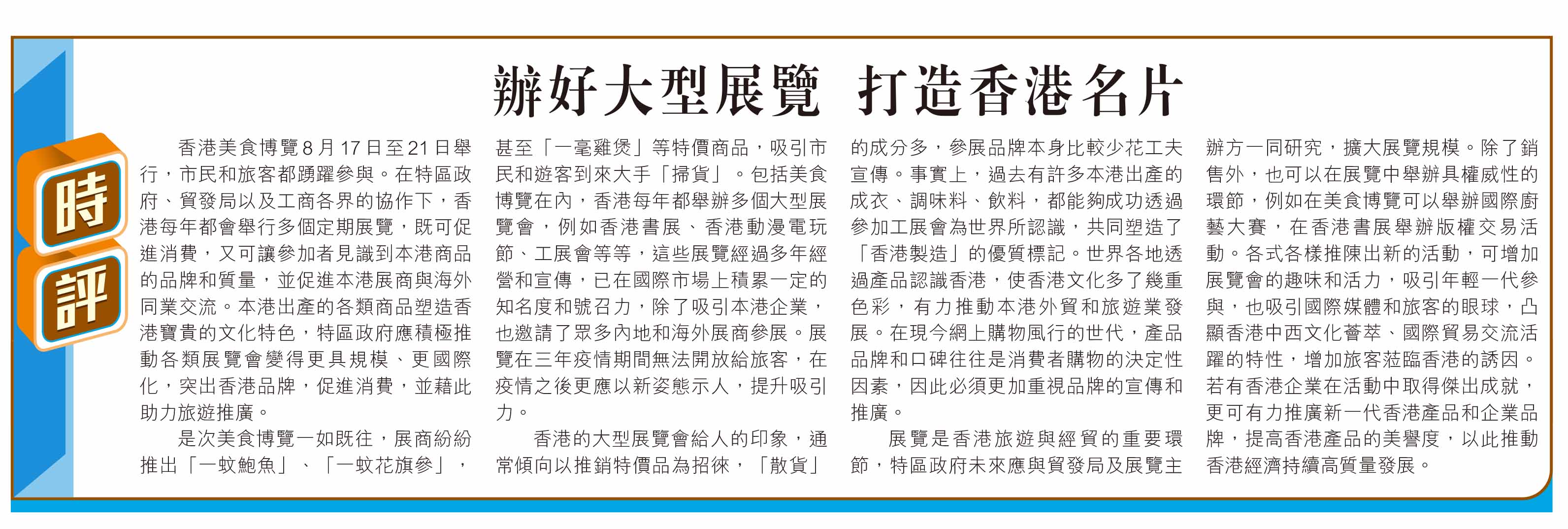 香港美食博覽8月17日至21日舉行,市民和旅客都踴躍參與。在特區政府、貿發局以及工商各界的協作下,香港每年都會舉行多個定期展覽,既可促進消費,又可讓參加者見識到本港商品的品牌和質量,並促進本港展商與海外同業交流。本港出產的各類商品塑造香港寶貴的文化特色,特區政府應積極推動各類展覽會變得更具規模、更國際化,突出香港品牌,促進消費,並藉此助力旅遊推廣。