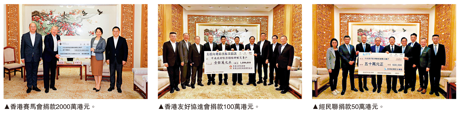 大公報報道,洪水無情,香江有愛。華北、東北部分地區出現極端強降雨並引發嚴重洪澇及地質災害後,香港社會各界踴躍捐款。近日,又有一批團體和企業表達了支援內地防汛救災的強烈意願。一筆筆善款凝聚一片片愛心,展現了內地與香港守望相助、齊心協力的血脈深情。中央政府駐港聯絡辦副主任盧新寧、尹宗華接收捐款時表示,衷心感謝大家的愛心和善舉,香港社會各界展現出的家國情懷令人感動,通過中聯辦賑災專戶捐贈的善款將盡快轉遞給受災地區。