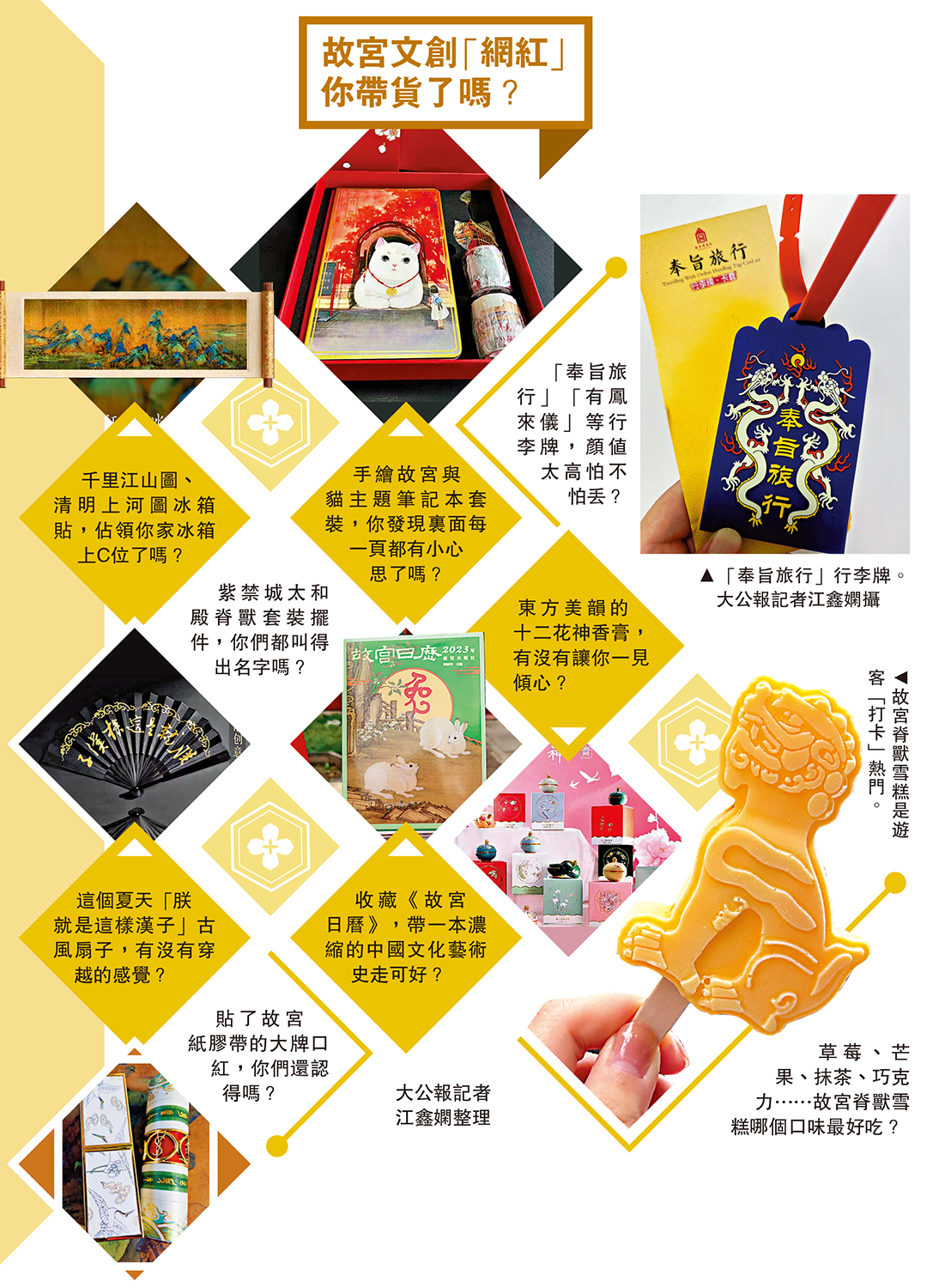 (大公報記者 江鑫嫻)脊獸雪糕、千里江山圖冰箱貼、十二花神香膏和筆、12月令書籤、宮貓筆記本、神龍宴小籠包擺件、故宮的雪限定口紅……這個暑期,故宮博物院依然是大批赴京遊客的首選打卡地。在這裏,與文物對話,感知深厚歷史、感悟文化魅力的同時,越來越多的年輕人選擇為喜愛的文創買單。「在故宮文創店看到什麼都想買回家慢慢欣賞、學習。現場未盡興,還要官網『補貨』。」不少遊客表示,每一件故宮文創都能找到相應的文物出處,讓觀眾看得上、買得起、用得着、學得到。據悉,故宮已擁有萬餘種文創,2017年產品年營業額就達15億元(人民幣,下同),被視為可借鑒的典範。相關負責人曾表示,所有銷售利潤都用於故宮自身事業發展。