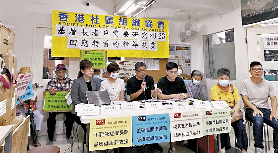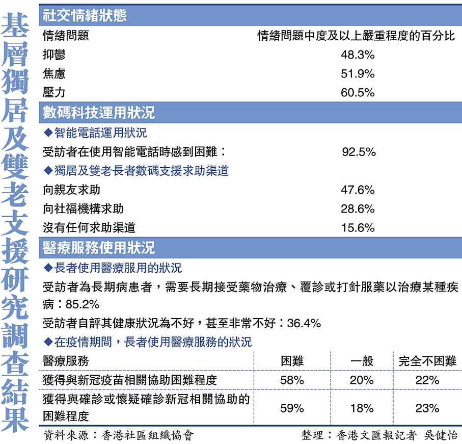 (香港文匯報記者 吳健怡)香港正面臨人口急劇老化的問題,特區政府提出「精準扶貧」策略,並識別三大群組需針對性支援,其中以獨居長者及雙老家庭構成的「長者戶」人數最多,佔逾55萬人。香港社區組織協會昨日公布一項研究顯示,疫情間基層長者缺乏子女支援,當中只有15%受訪基層長者經常與子女聯絡,另僅得8%受訪者經常從子女獲得情感支援。社協建議特區政府於長者中心恒常設立「數碼大使」,推動數碼共融,並為長者提供適切支援;而為協助較隱蔽及有複雜醫療需要的「長者戶」,則需以外展及個案管理模式提供社區基層醫療服務。