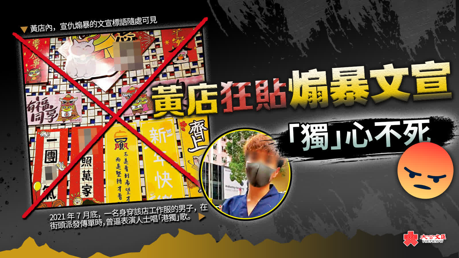 記者翻查資料,發現這間「東X街」自2020年12月開業以來,一直在黃色經濟圈內煽暴煽獨,店內展示有大量的煽暴文宣。翻查該店專用社交媒體賬號fb,在2020年7月香港國安法實施後仍不收手,繼續煽暴抗爭,甚至接受法輪功旗下的獨媒及黃媒採訪,在黃色經濟圈中催谷生意。