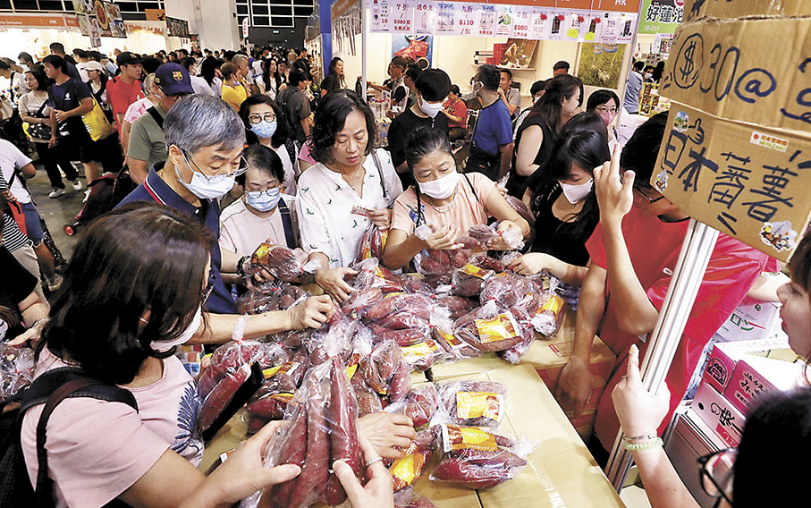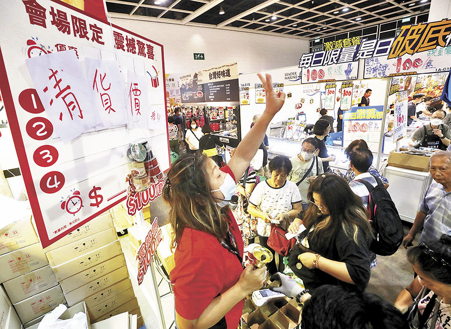 (香港文匯報記者 張弦)「10蚊一包曲奇」、「100蚊六包意粉」、「250蚊鮑魚買一送一」……一連5天在香港會展中心舉行的美食博覽昨日閉幕,不少參展商推出減價促銷快閃優惠「要錢唔要貨」,吸引大批市民及旅客到場搶購平貨。今屆可謂「丁財兩旺」,主辦方香港貿發局表示聯同美食博覽在內的5個展覽,共吸引近48萬人次入場,適逢第二階段的電子消費券派發,受訪入場者的人均消費額約1,500元,較去年上升超過8%。有參展商表示生意額按年上升約三成,恢復試食吸引大批顧客品嘗後購買;亦有參展商表示今次推出很多優惠套裝給市民選購,純利削減也在所不惜,「就當係賣廣告、打響知名度,最緊要市民開心。」
