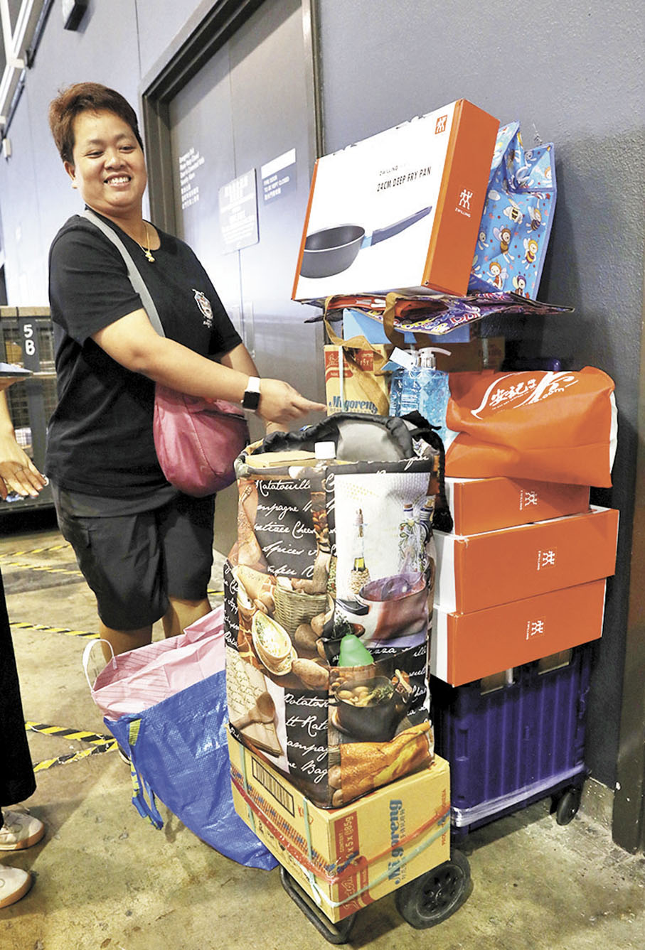 居港的印尼裔安妮購買的「戰利品」堆滿了牆邊一個小角落,有鍋、海味等產品,安妮表示剛從家電·家居·博覽「血拚」了一個回合,才轉戰美食博覽繼續購物。她表示知道昨日是幾個展覽最後一天,因此專門帶了3個車仔來掃貨,並一早開了車在樓下等候「車戰利品回家」。