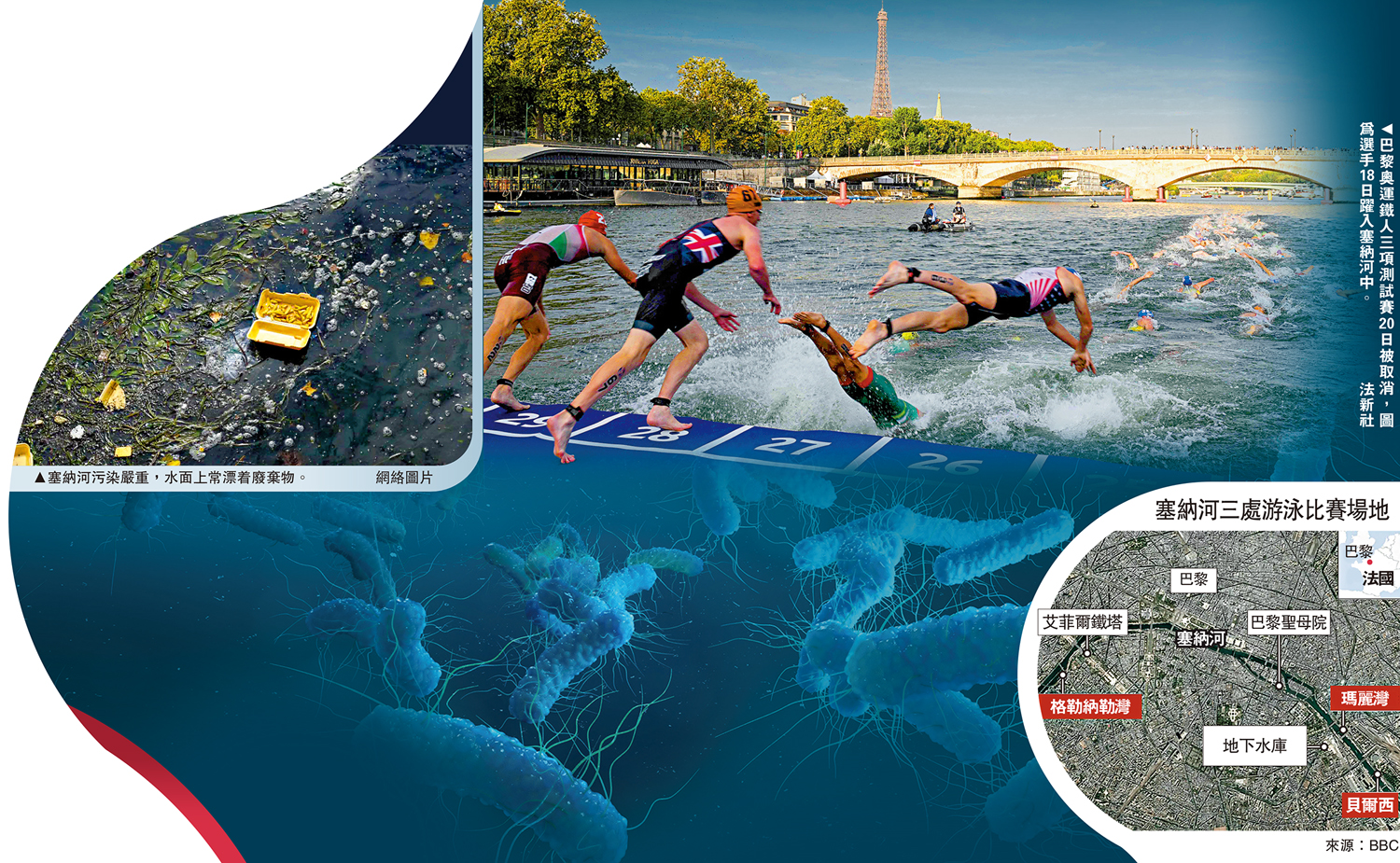 巴黎奧運會組織委員會和世界鐵人三項運動的監督機構表示,由於塞納河的水質分析無法提供「必要保證」,原定於20日在巴黎舉行的2024奧運會鐵人三項,取消有用賽段的測試賽。
