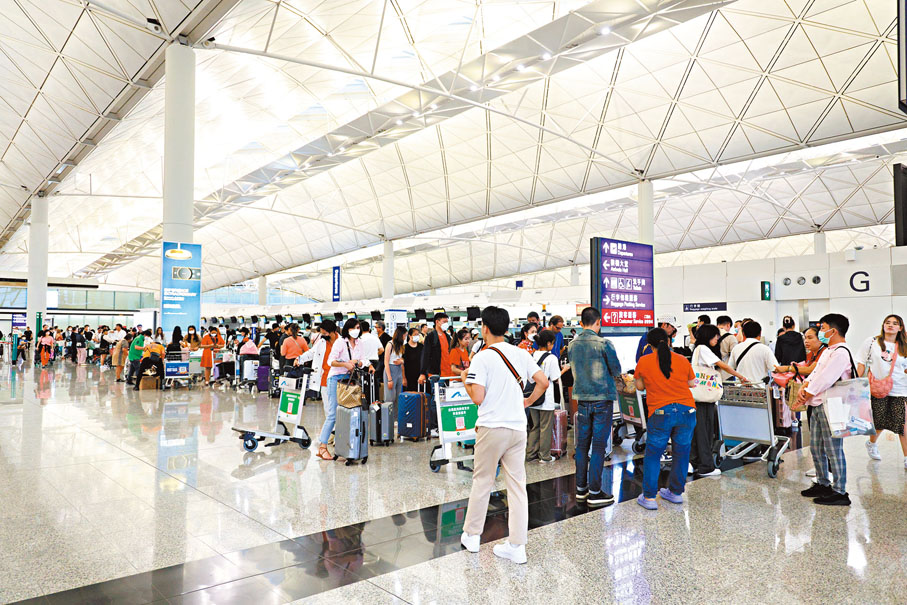 (香港文匯報記者 費小燁)自從疫後恢復全按月升14.9% 客運量回復至疫前六成面通關後,訪港旅客和外遊港人數目逐漸回升,香港航空業一直展現復甦勢頭。香港機場管理局昨日公布,上月香港國際機場的客貨運量同告持續上升,月內共接待逾380萬人次旅客,按月升14.9%,按年更大升8.5倍;飛機起降量和貨運量亦分別按月增加7.4%和1.7%。數據顯示,上月每日平均客運量逾12萬人次,回復至疫情前60%水平。有香港旅行社表示,相信運力要待明年第一季和第二季才能回復至疫前八成至九成水平,屆時市民外遊或不用捱貴機票,對旅行社亦有幫助。