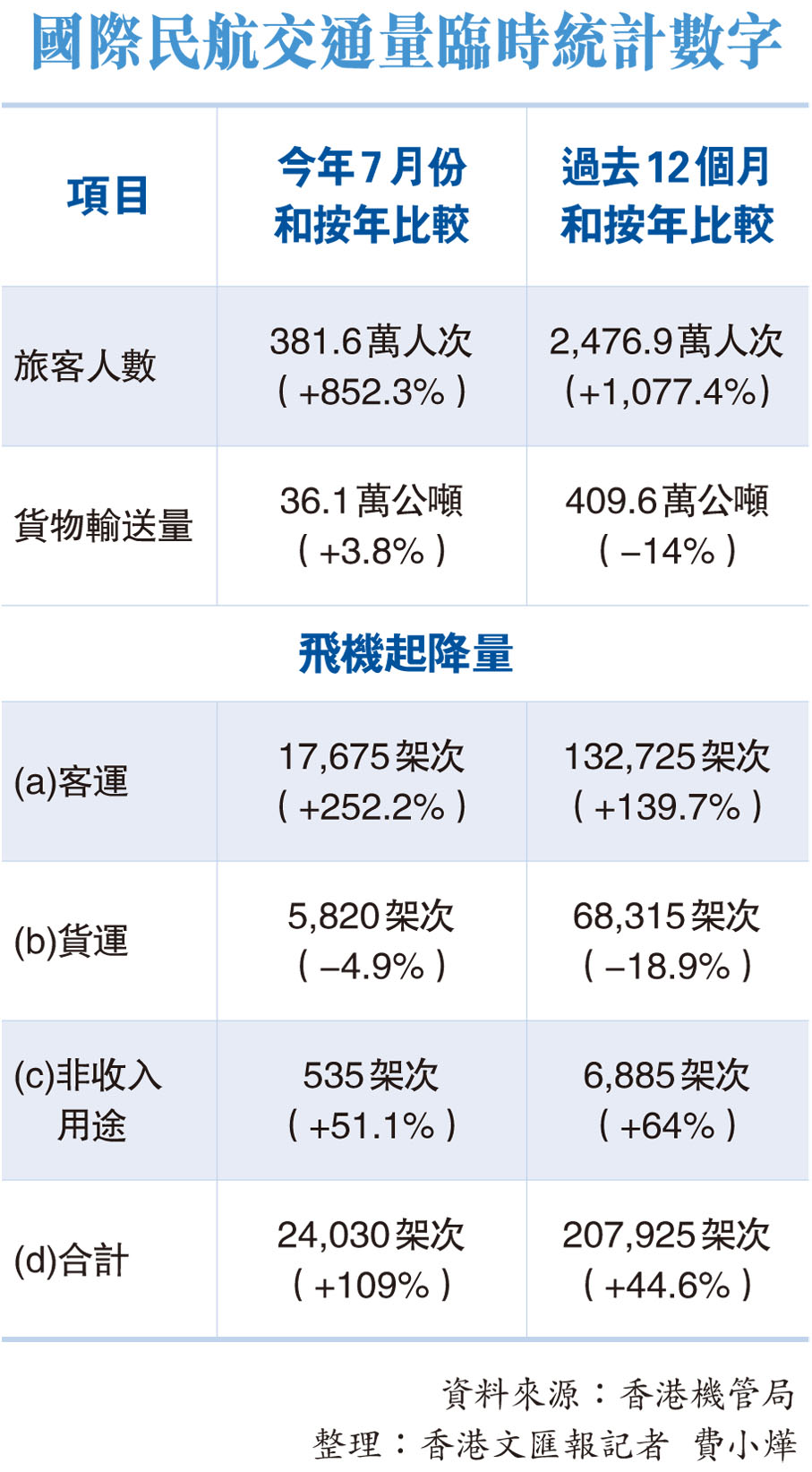 總結今年首7個月的數據,機場客運量較去年疫情下同期的低基數上升逾15倍,至2,040萬人次;飛機起降量按年增加94%,至142,840 架次;貨運量則按年跌4.2%,至240萬公噸。過去12個月,機場客運量按年比則大幅增加10倍,至近2,480 萬人次;飛機起降量上升44.6%,至207,925 架次;貨運量則下跌14%,至近410萬公噸。