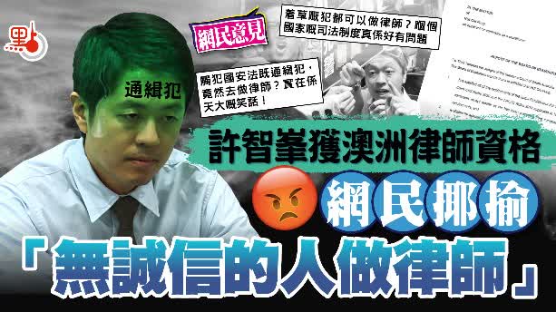 大公文匯全媒體報道,棄保潛逃的前立法會議員許智峯,上月初方被警務處國家安全處懸紅100 萬元通緝。他昨在社交平台發文,透露已在南澳最高法院完成宣誓,並獲法庭頒令正式認許他為律師。不少網民留言揶揄「一個無誠信的人做律師」、「個觸犯國安法既通緝犯,竟然去做律師?實在係天大嘅笑話!」、「着草嘅犯都可以做律師?嗰個國家嘅司法制度真係好有問題」。