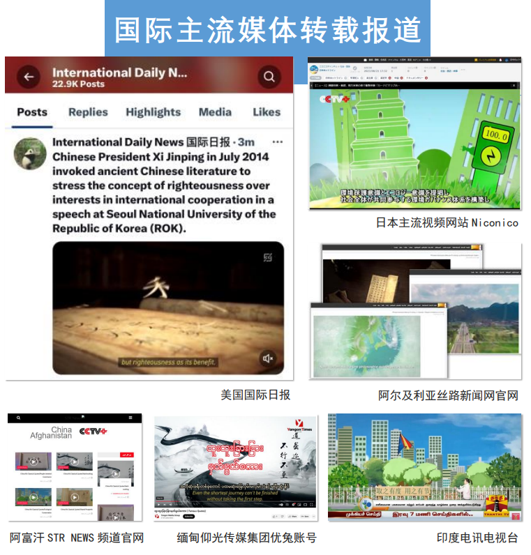 截至8月21日18時,日本主流視頻網站Niconico、阿爾及利亞絲路新聞網官網、科摩羅廣播電視總局所屬頻道、阿富汗STR NEWS、美國國際日報等14個國家和地區的21個電視台及新媒體平台播發轉載了相關報道。