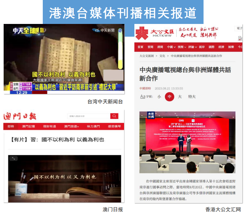 此外,南非金磚電視台、南非ENCA電視台、馬達加斯加TV Plus、烏干達BBS電視台、《贊比亞時報》、贊比亞國家通訊社、納米比亞《日報》等媒體也正陸續刊播節目相關內容。