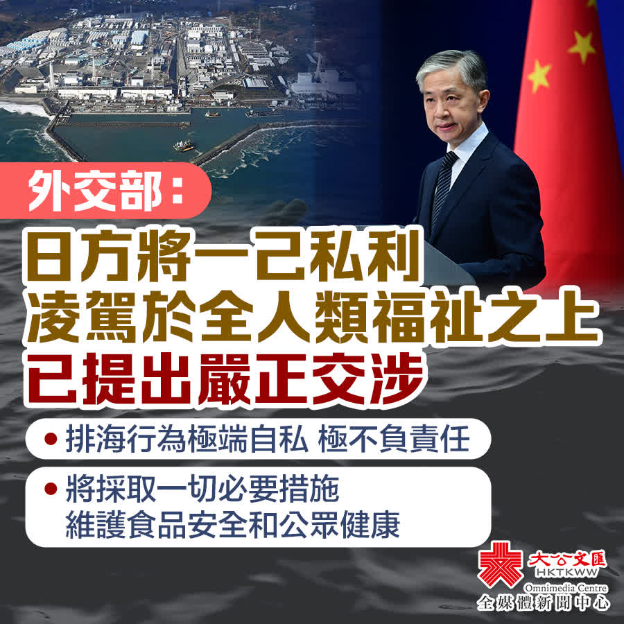 大公文匯全媒體報道,在8月22日的外交部例行記者會上,有記者提及,日本今日宣布,最早將於8月24日開始排放福島核污染水。對此,外交部發言人汪文斌回應表示,日本政府不顧國際社會嚴重關切和堅決反對,執意宣布將於8月24日啟動福島核污染水排海,公然向全世界轉嫁核污染風險,將一己私利凌駕於全人類長遠福祉之上,此舉極端自私,極不負責任。中方嚴重關切並強烈反對,已向日方提出嚴正交涉。