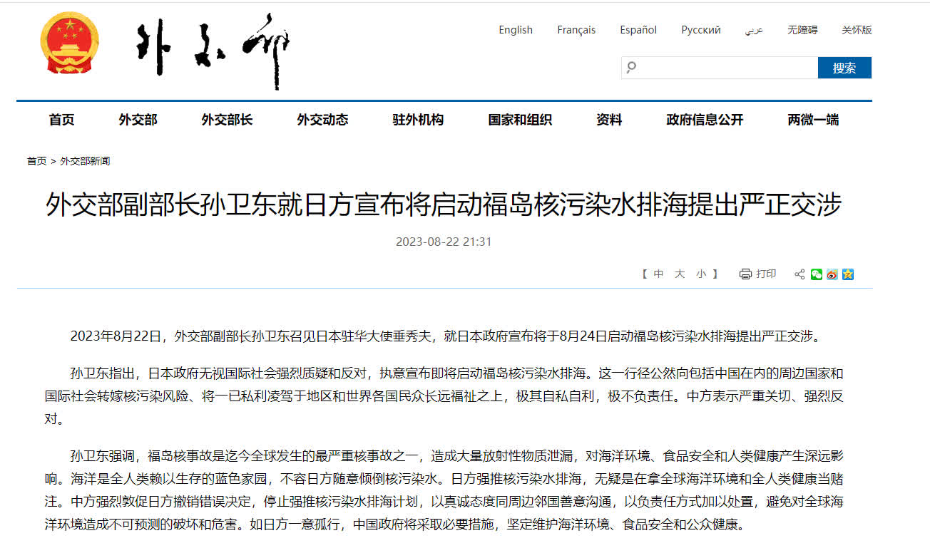 據外交部網站消息,8月22日,外交部副部長孫衛東召見日本駐華大使垂秀夫,就日本政府宣布將於8月24日啟動福島核污染水排海提出嚴正交涉。