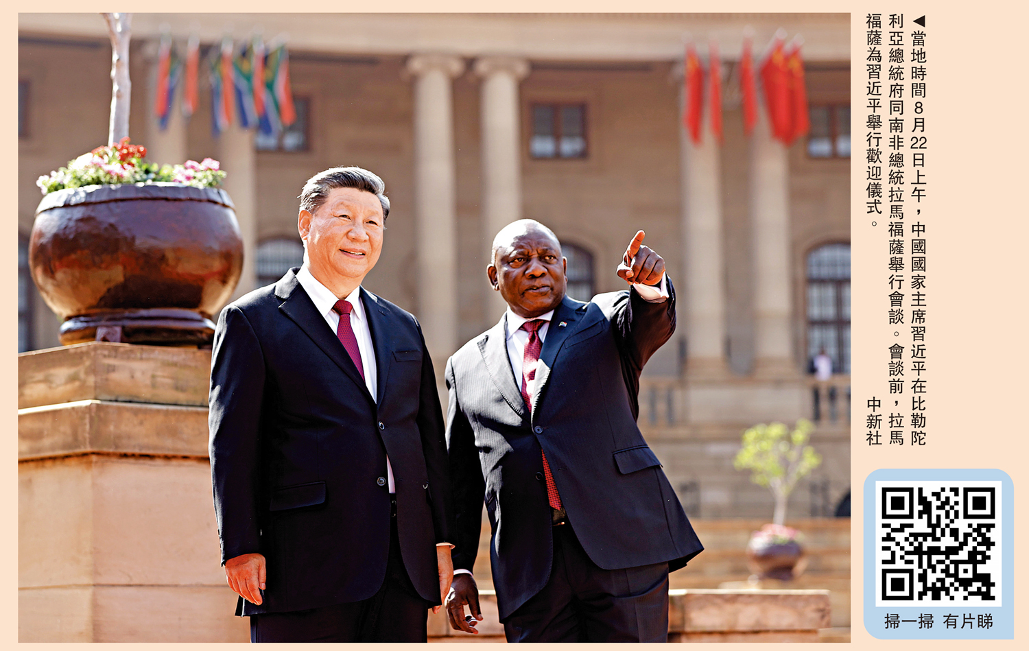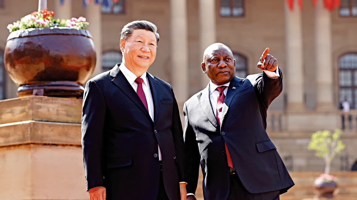 當地時間8月22日上午,國家主席習近平同南非總統拉馬福薩舉行會談。習近平指出,近年來,金磚國家秉持開放包容、合作共贏的金磚精神,書寫了不同制度、不同文化、不同地域國家攜手發展的精彩故事,成為南南合作的一面金字招牌。南非為這次金磚國家領導人會晤作出精心籌備,我對此高度讚賞。我期待同金磚國家領導人一道,共商新時代金磚團結發展大計,推動會晤取得豐碩成果,推動全球治理朝着更加公正合理的方向發展。