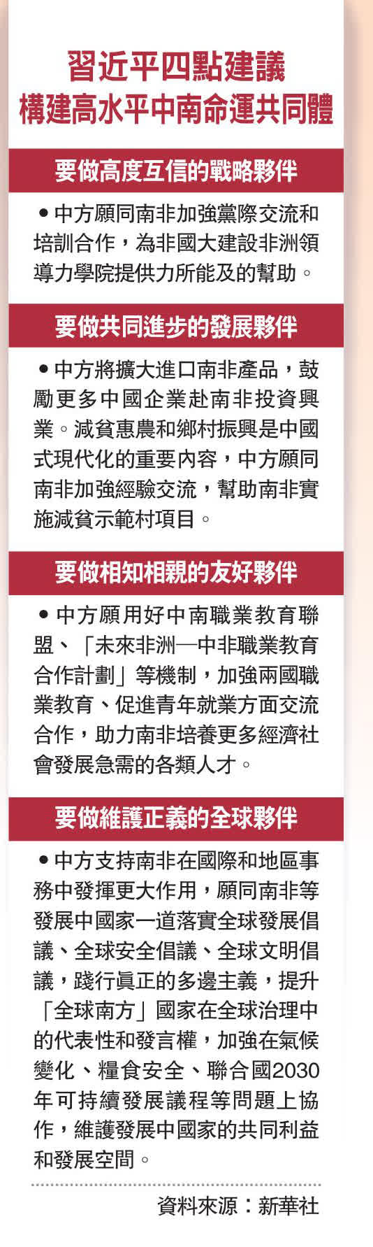 第三,中南要做相知相親的友好夥伴。民心相通是兩國友好的生動體現。中方願用好中南職業教育聯盟、「未來非洲─中非職業教育合作計劃」等機制,加強兩國職業教育、促進青年就業方面交流合作,助力南非培養更多經濟社會發展急需的各類人才。雙方要加強旅遊合作,支持科研機構和企業加強技術合作和聯合研究,讓合作成果更多惠及兩國人民。