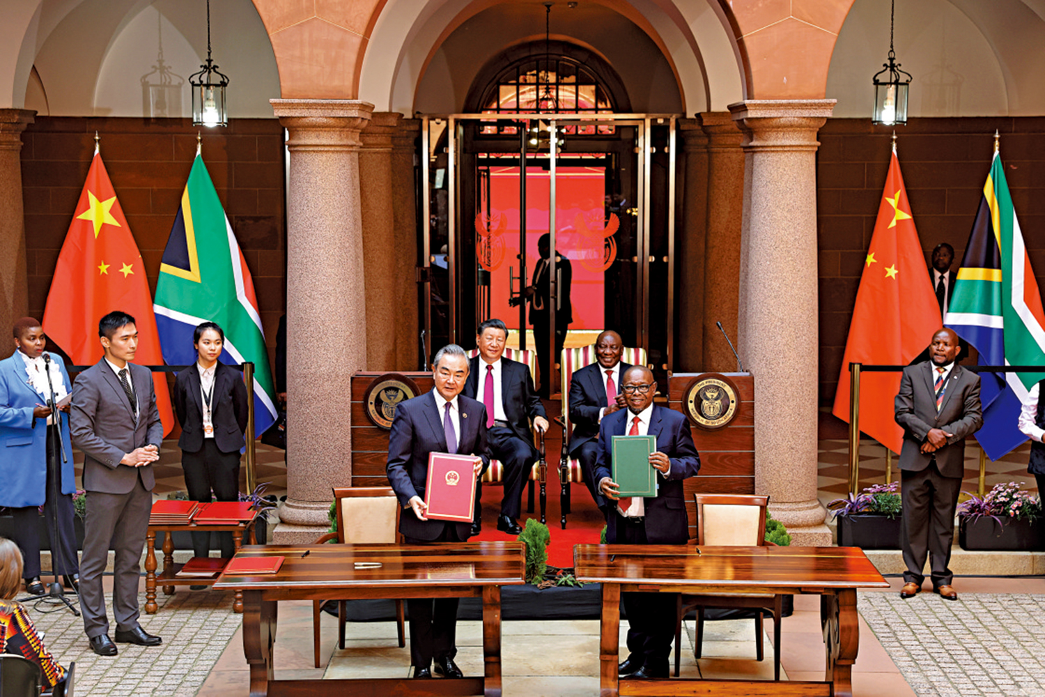第四,中南要做維護正義的全球夥伴。獨立自主是我們共同堅守的原則。中方支持南非在國際和地區事務中發揮更大作用,願同南非等發展中國家一道落實全球發展倡議、全球安全倡議、全球文明倡議,踐行真正的多邊主義,提升「全球南方」國家在全球治理中的代表性和發言權,加強在氣候變化、糧食安全、聯合國2030年可持續發展議程等問題上協作,維護發展中國家的共同利益和發展空間。