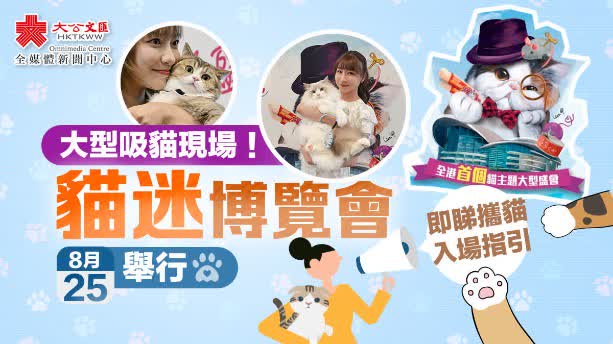 大公文匯全媒體報道,貓迷睇過嚟!首屆香港貓迷博覽會將於8月25日舉行,屆時可攜帶貓貓入場,共同參加首個以貓咪為主題的大型展會。活動結合了購物、中西藝術創作、音樂、表演、講座等內容,大型平安貓山同大家見面打卡,讓一眾貓貓們及貓奴可以在此休憩遊玩!仲有豐富獎品等你抽取!