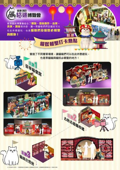 「香港貓迷博覽會2023」內設有各種貓主題的展區,多項精彩活動及不同遊戲舉行,包括貓迷文創市集、貓迷潮玩館及雲集中西藝術作品的貓藝廊。